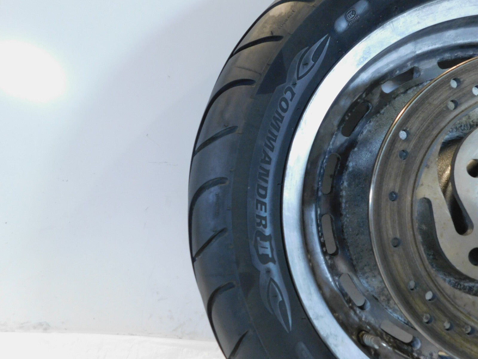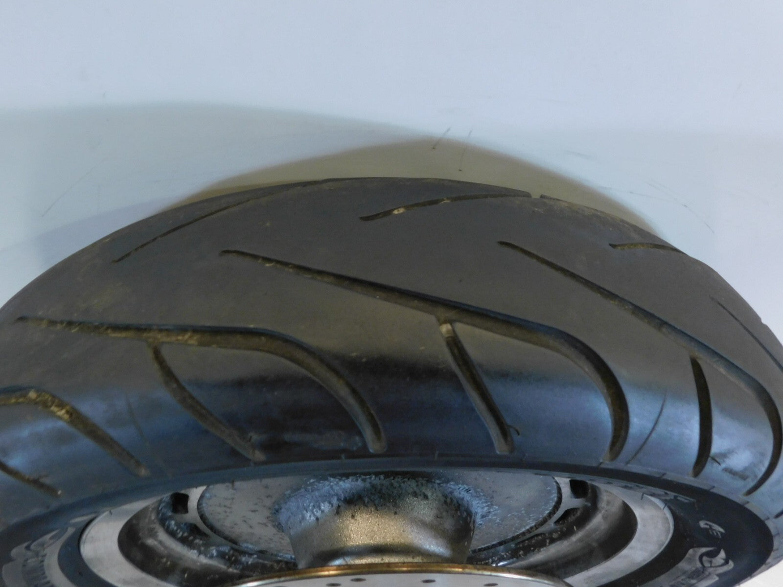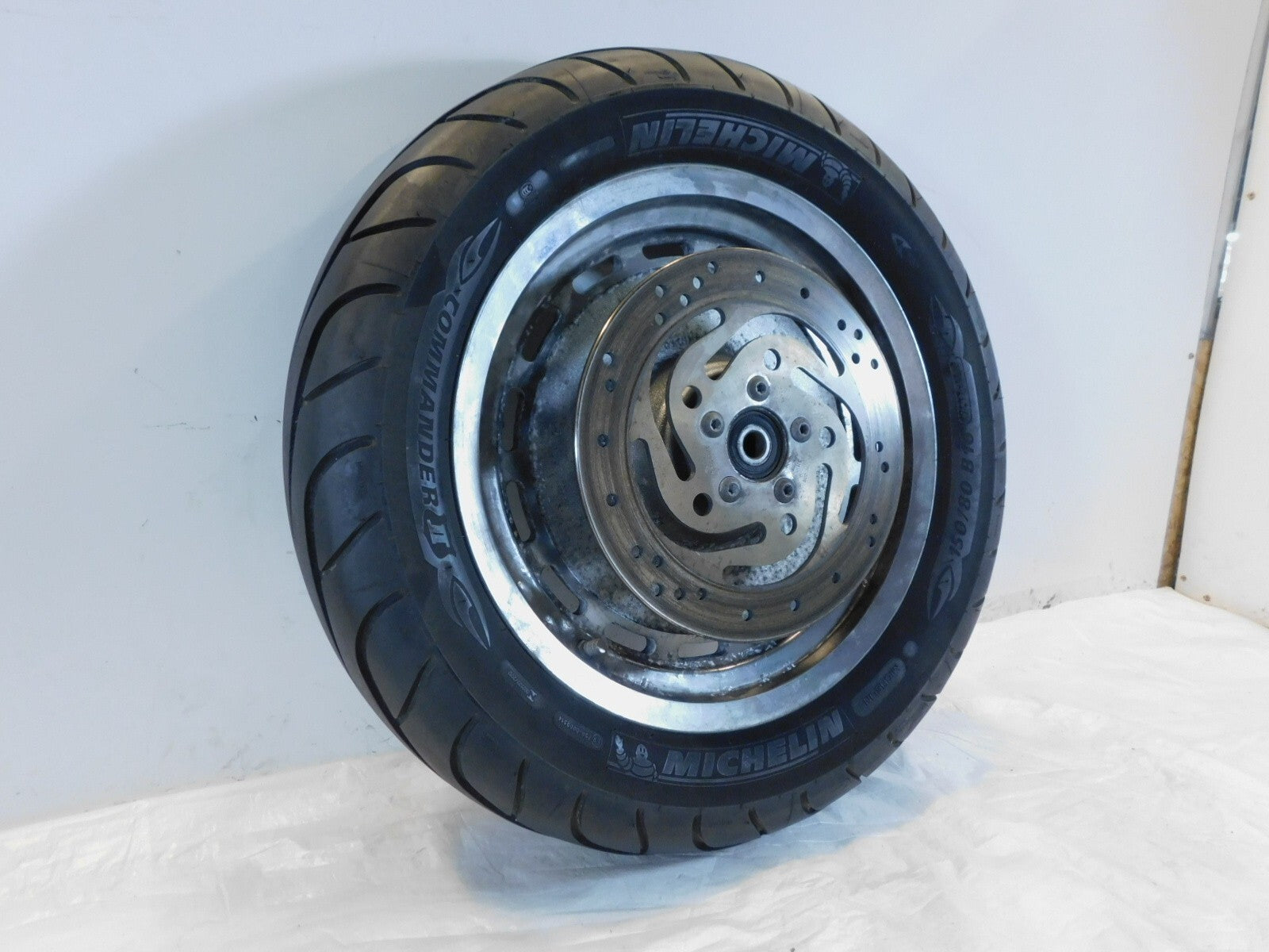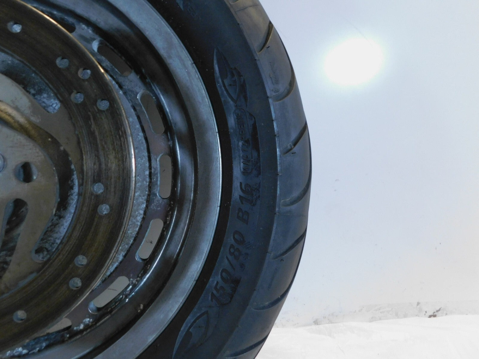This is a used rear wheel. It is dirty and discolored from previous use; there is some pitting and chipping in the chrome (as pictured).