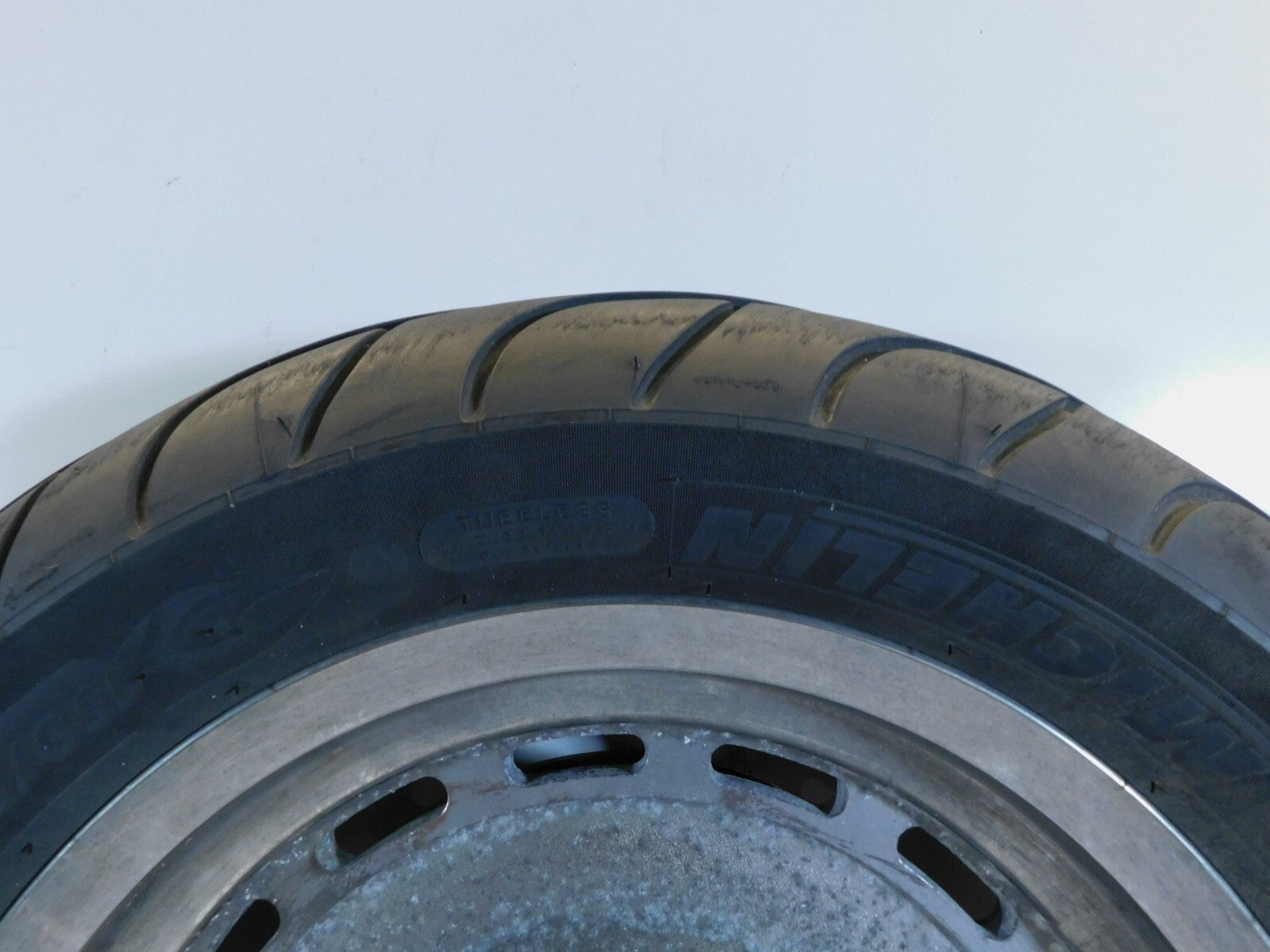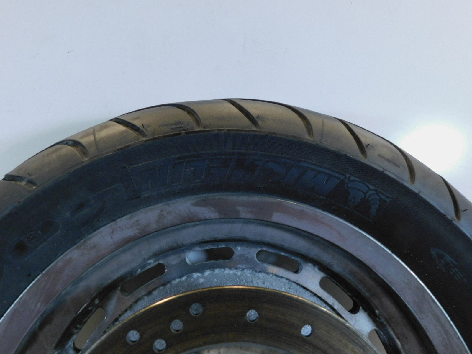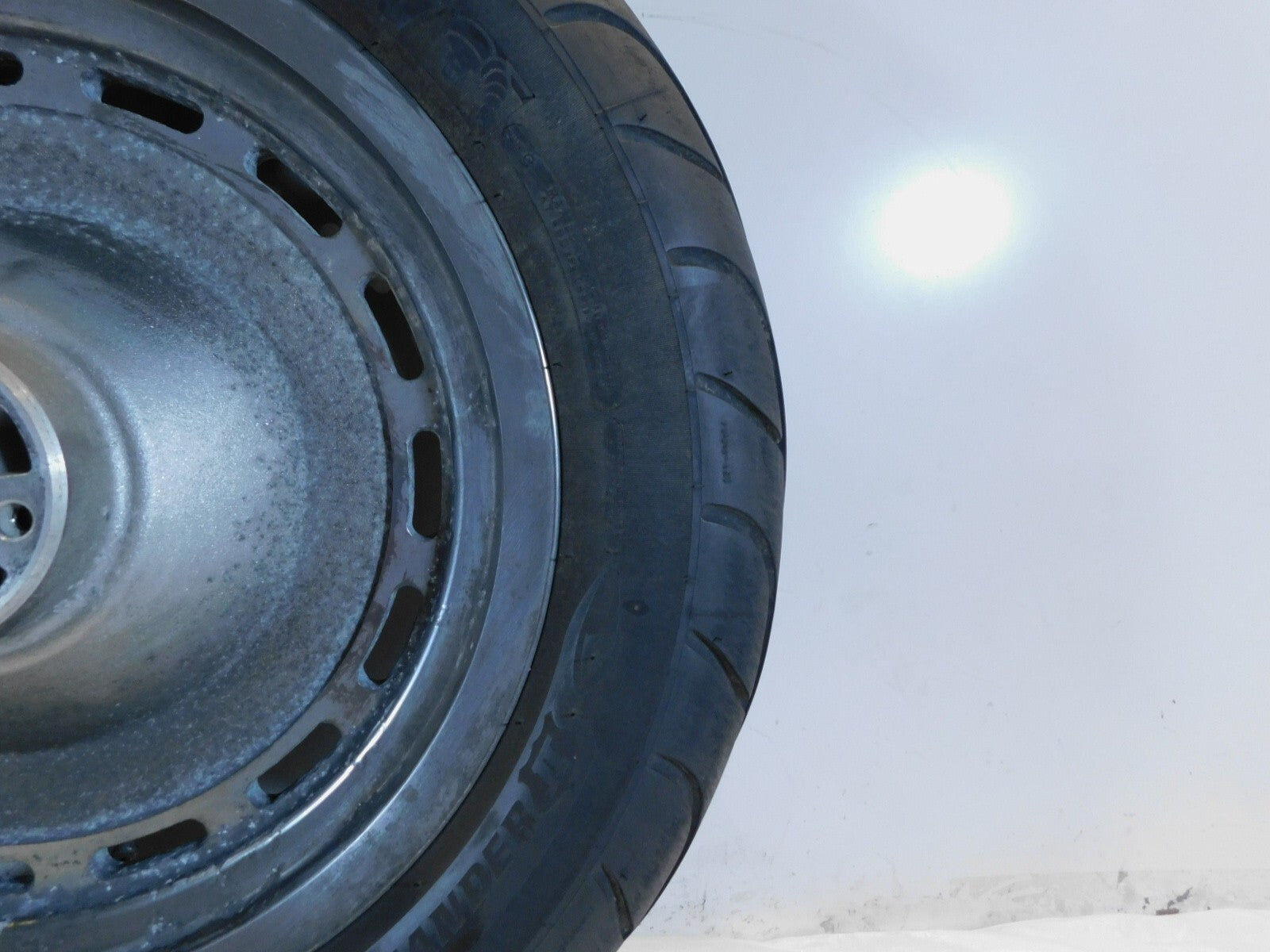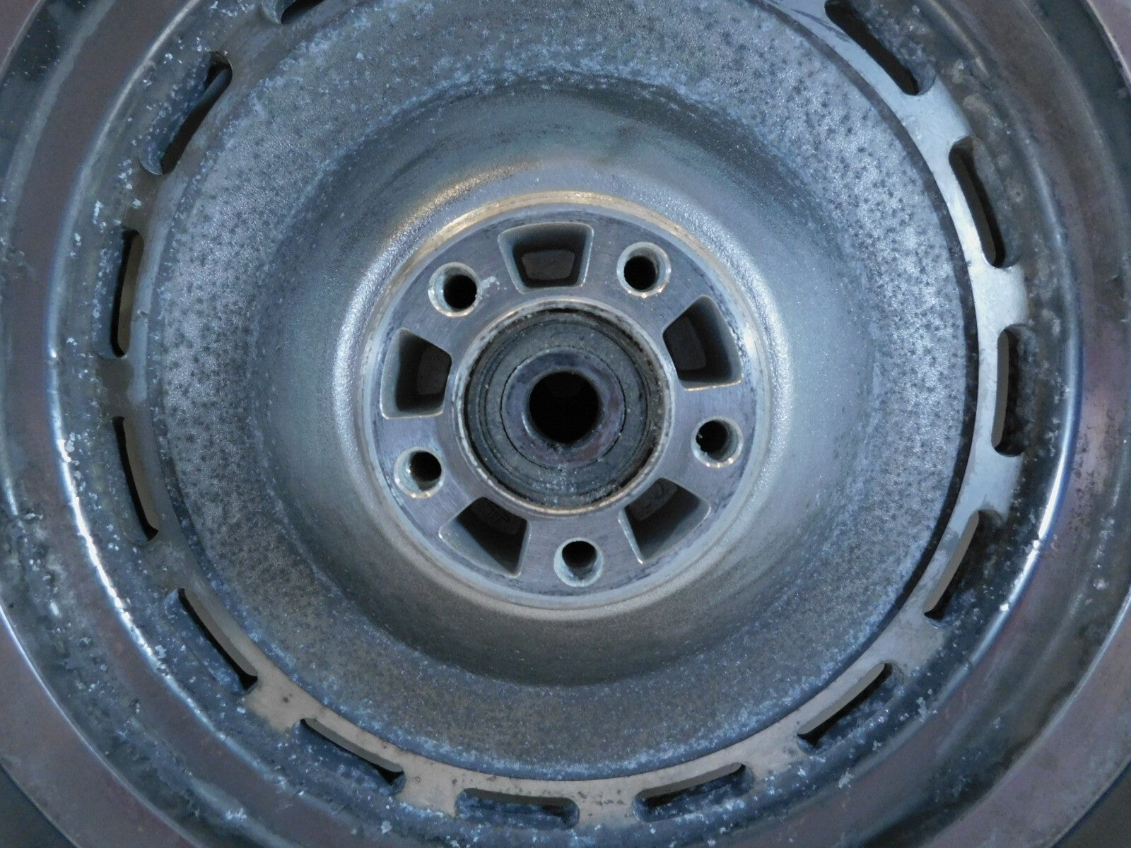 This is a used rear wheel. It is dirty and discolored from previous use; there is some pitting and chipping in the chrome (as pictured).