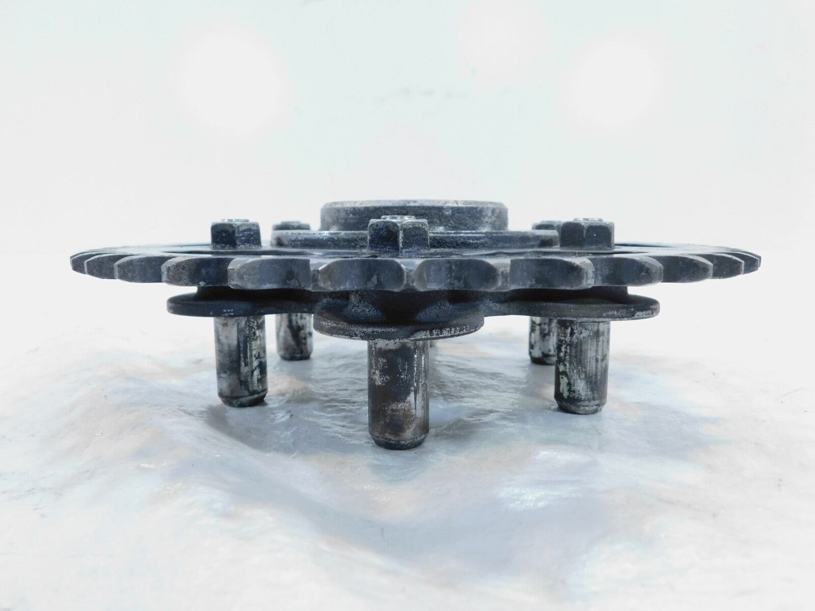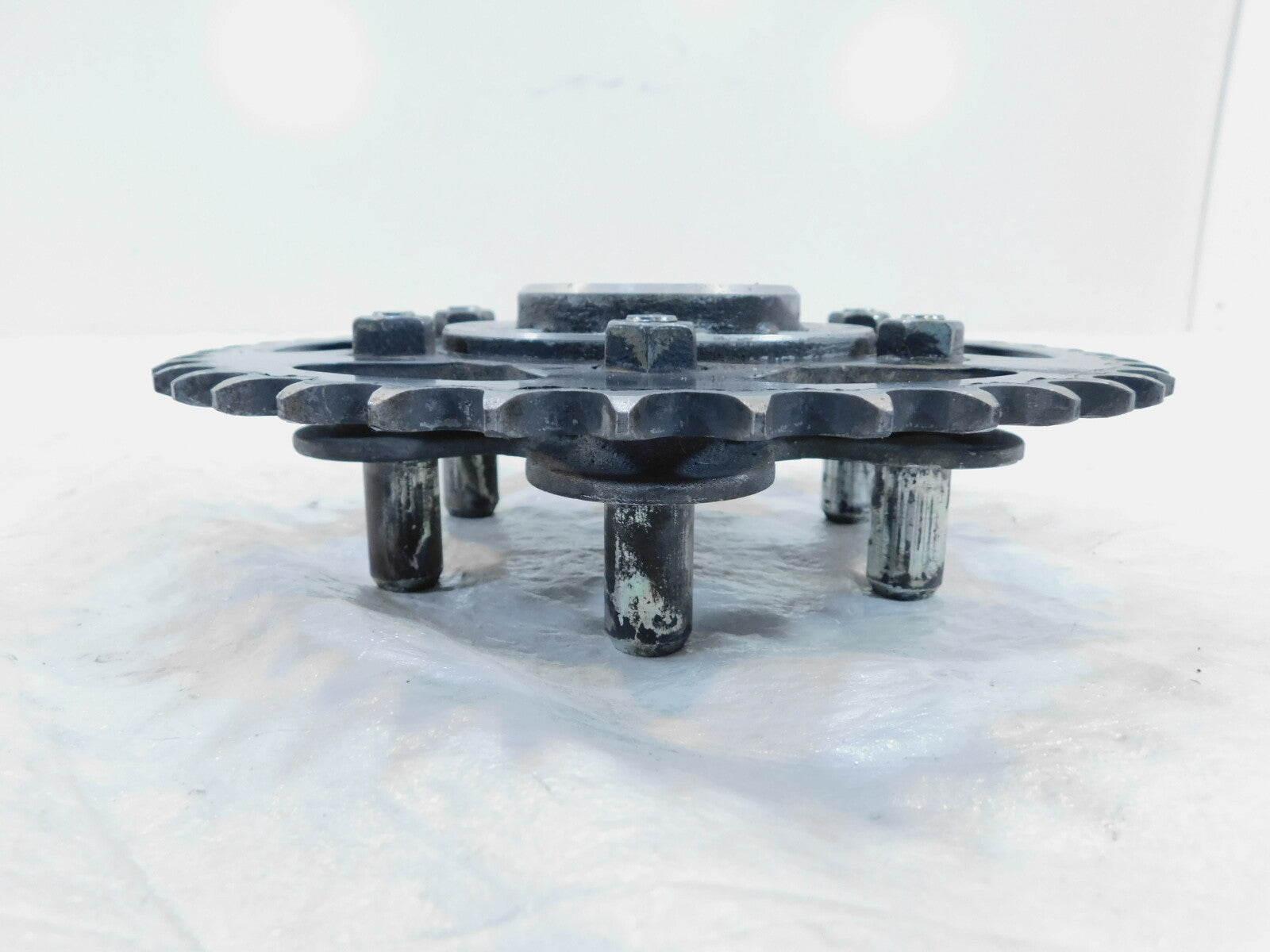 This is a used sprocket and flange in good condition. The parts are dirty and have marks from previous use and storage but look good.