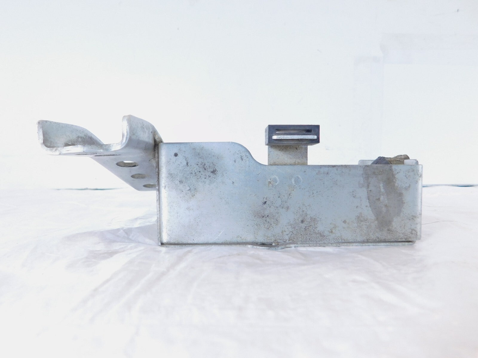This is a used ECM mount bracket in good condition. It is little dirty from previous use and there are some small spots of pitting and discoloration (as pictured).