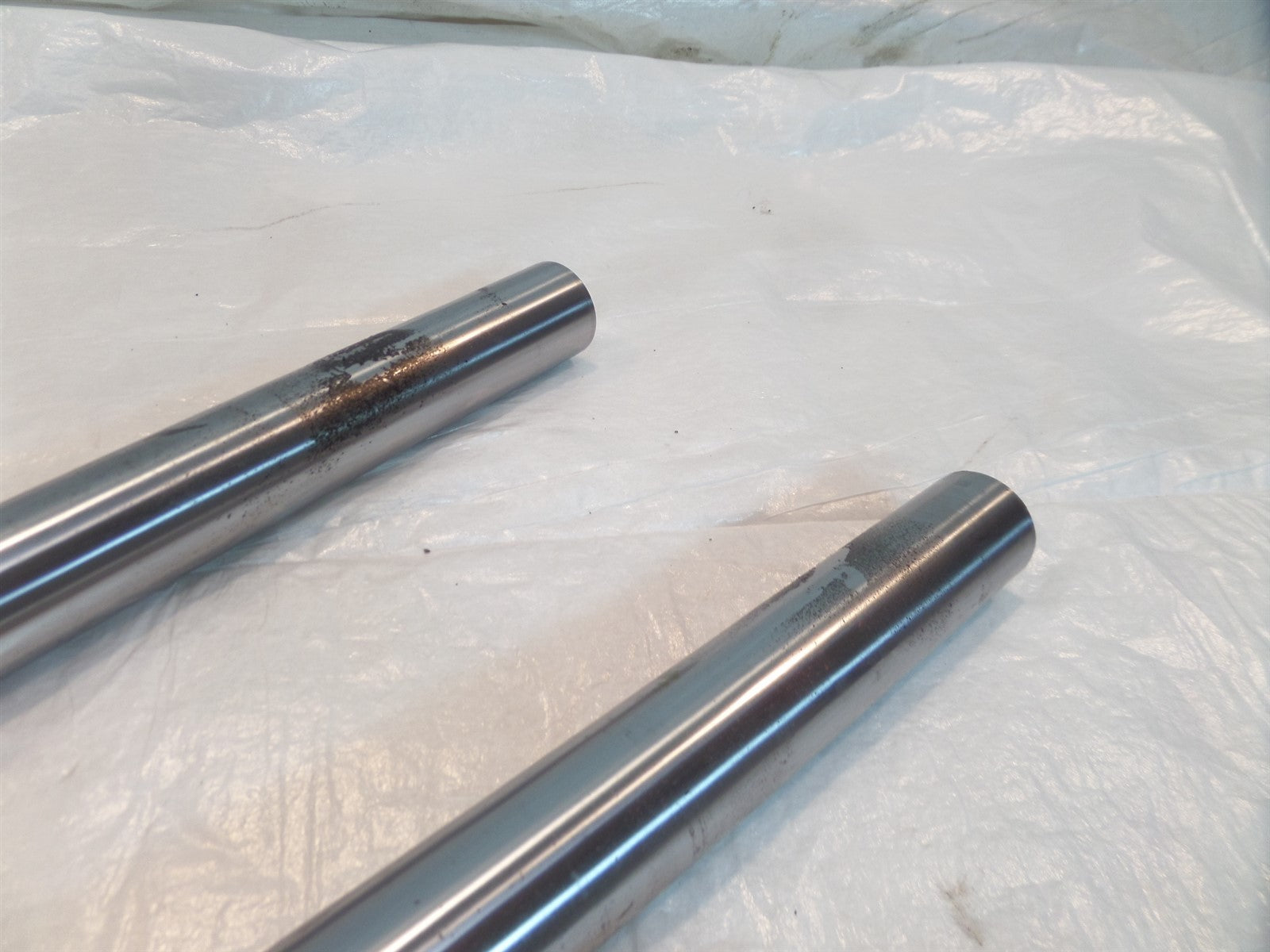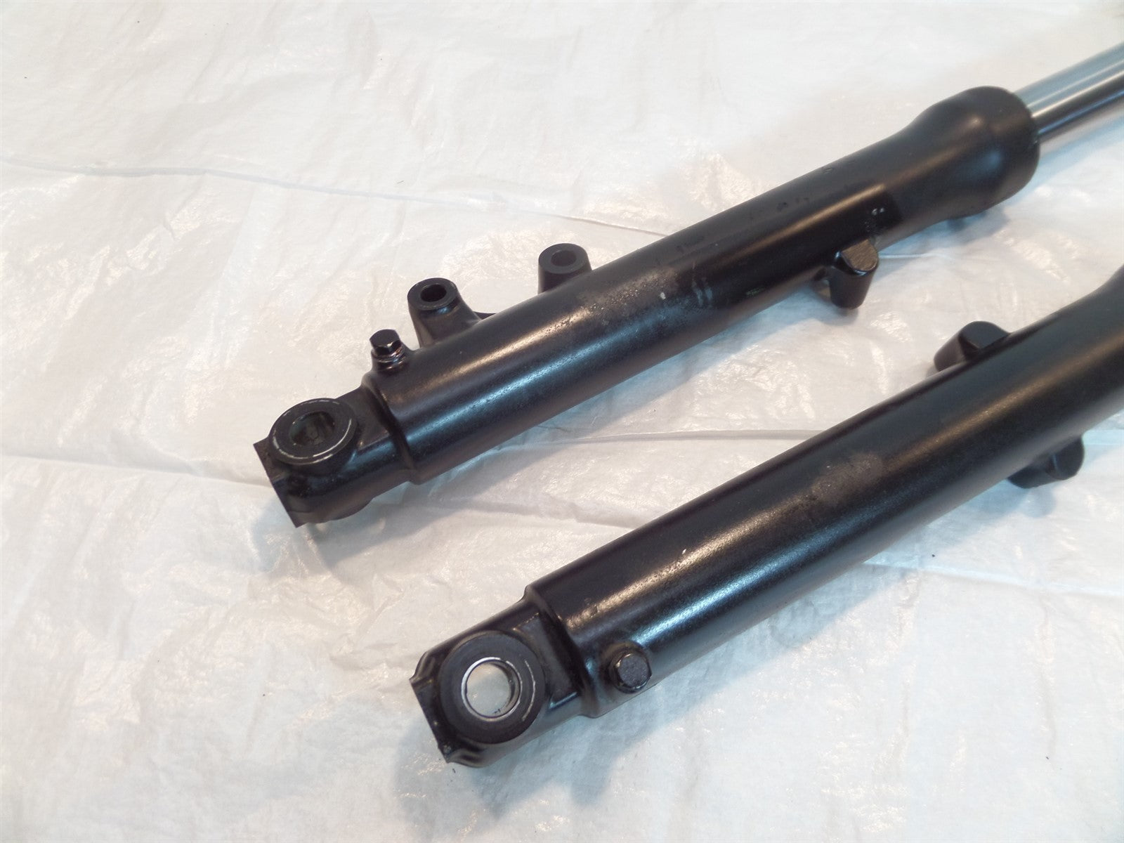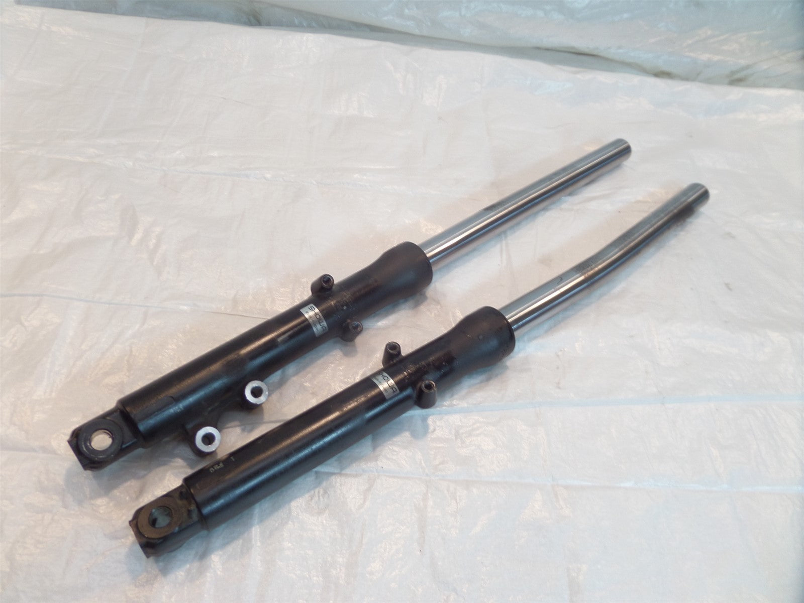This is a used set of forks. There are some light marks from previous use and they are bent (as pictured). Since these forks are bent they are being sold for parts or repair only.