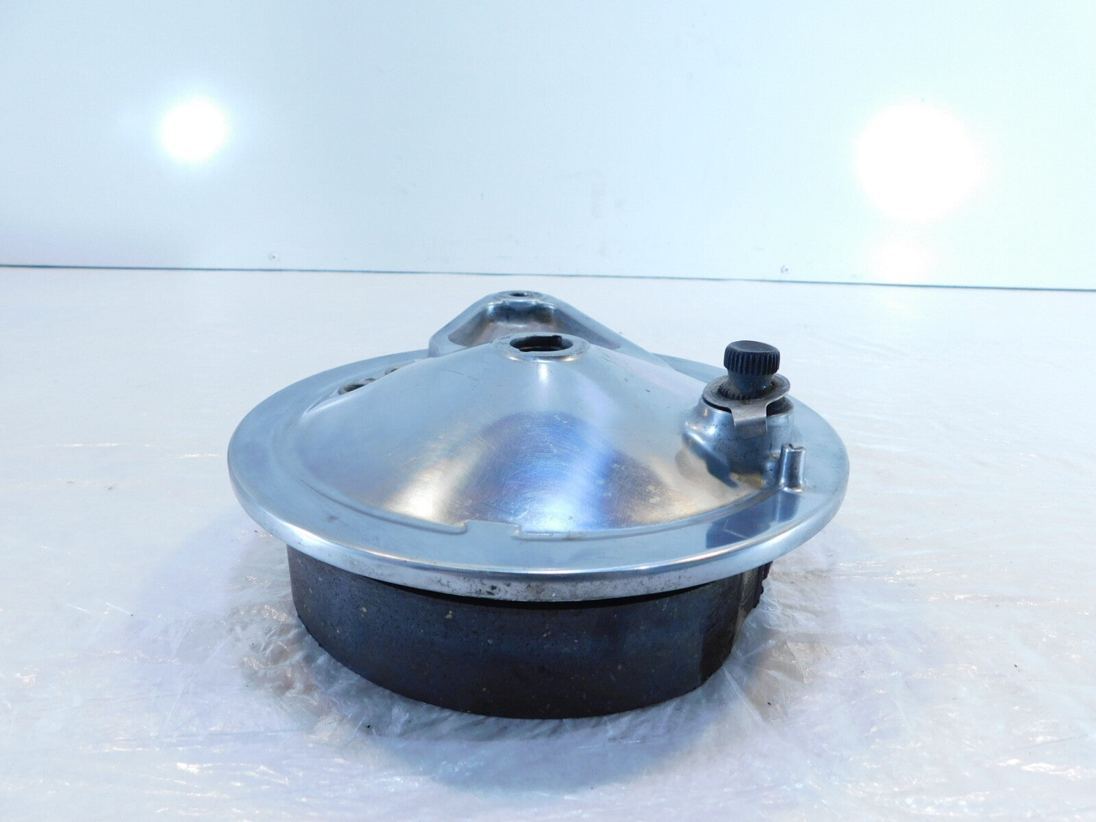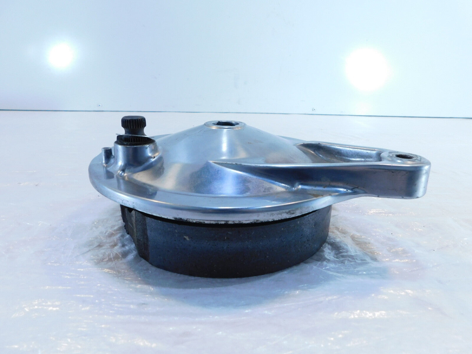 This is a used rear brake hub. There are some light marks from previous use and storage and wear from use.