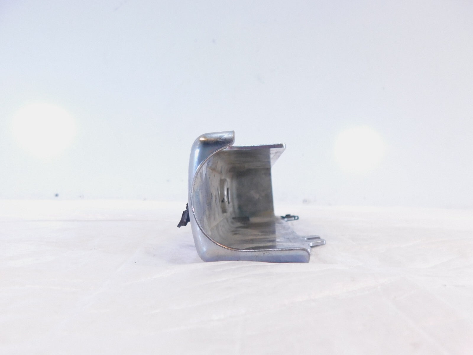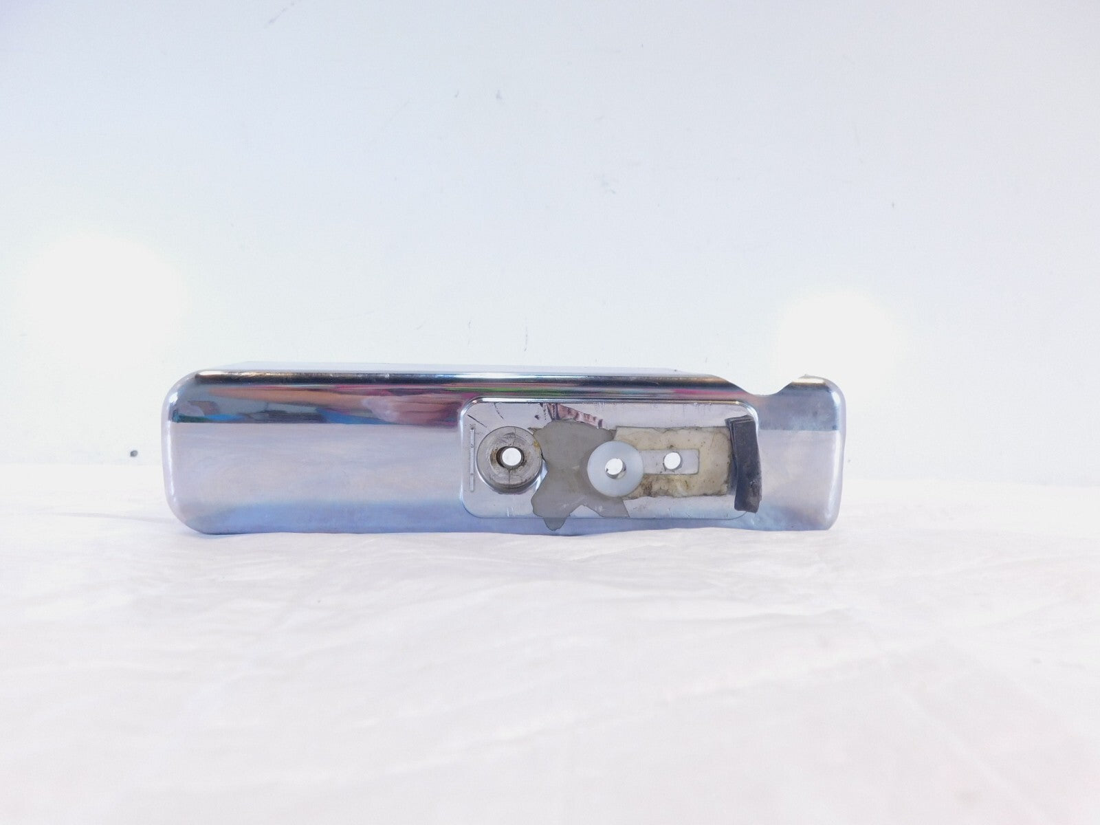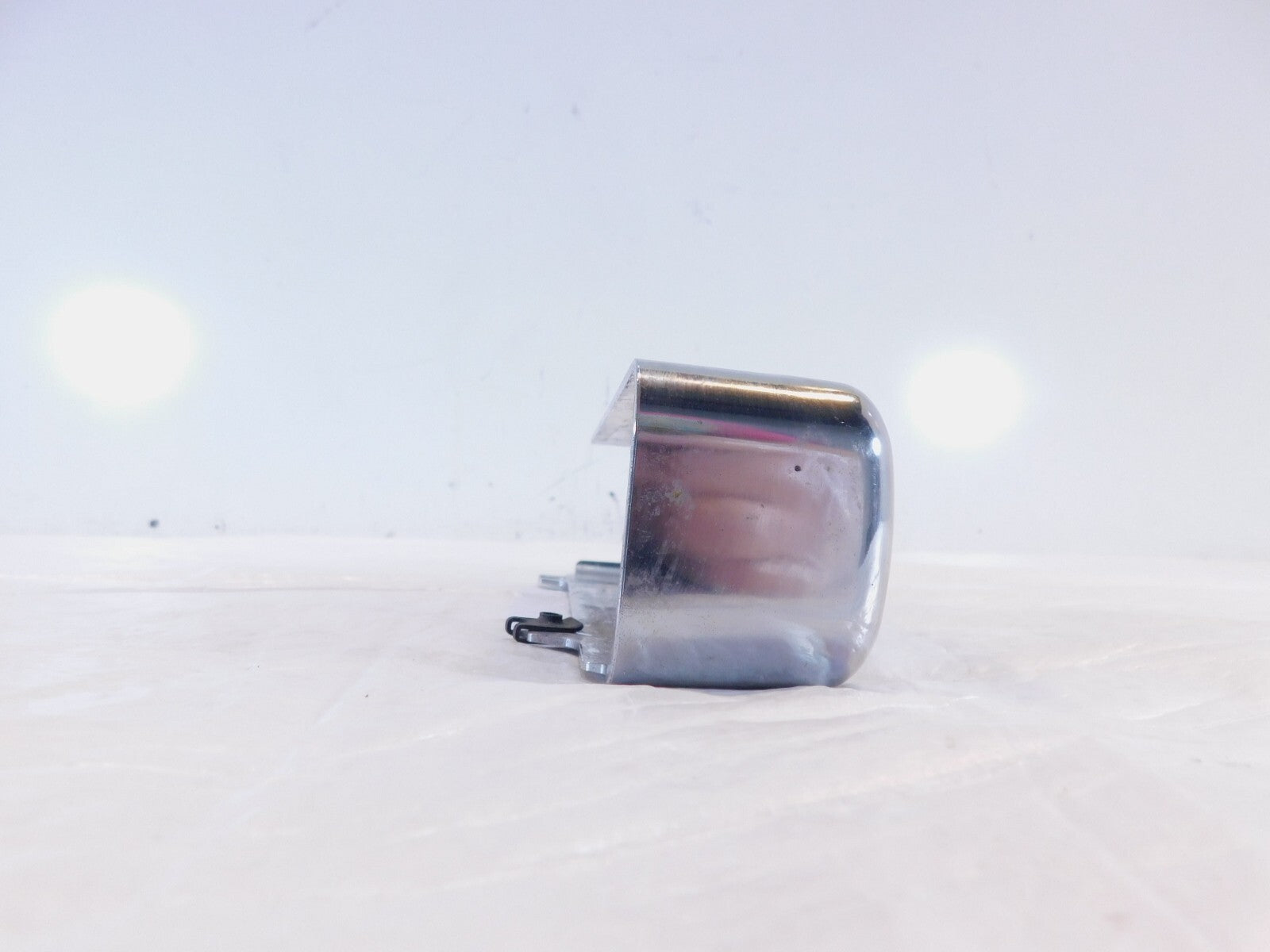 This is a used radiator cover in good condition. There are some light marks from previous use and storage and there is some pitting, chipping of the chrome and a reflector missing (as pictured).