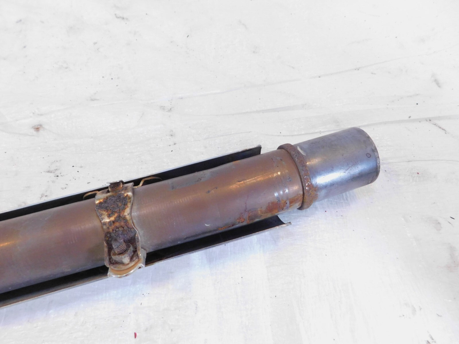 This is a used header pipe. It is a little dirty from previous use and there is some scratching on the chrome covers as well as surface rust and discoloration on the pipe (as pictured). There is also a dent in the shield (as pictured).