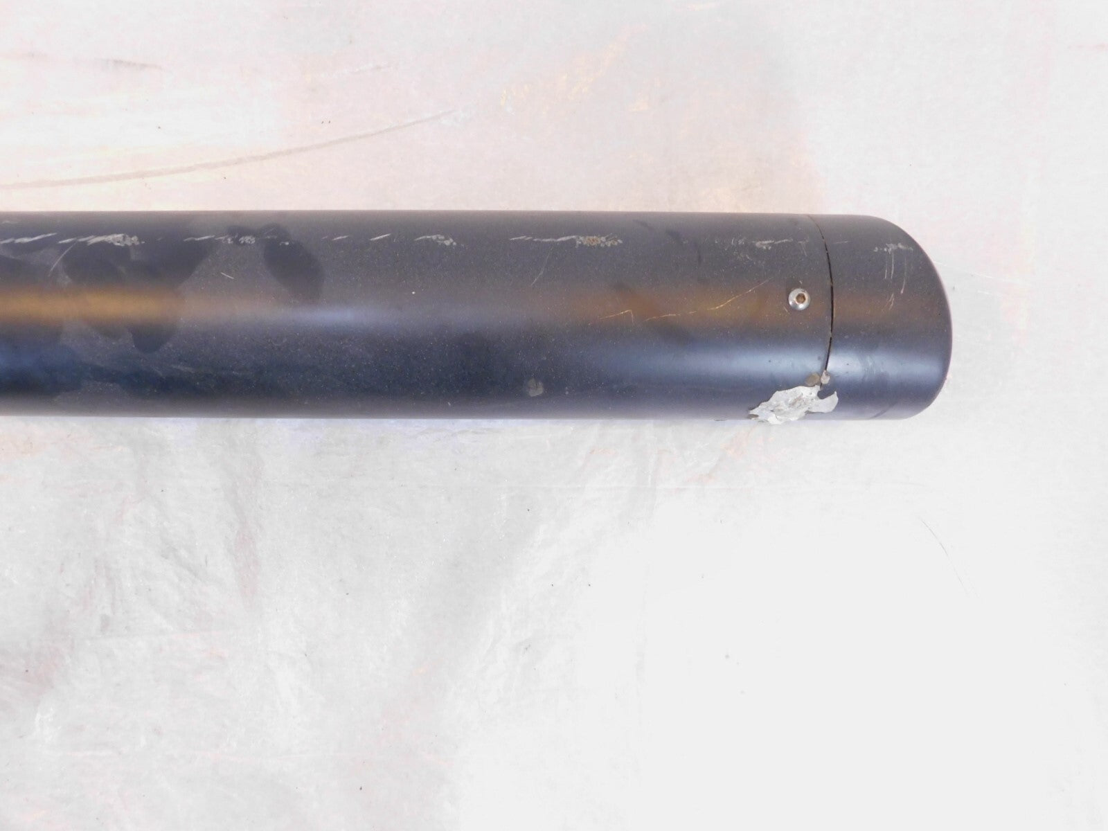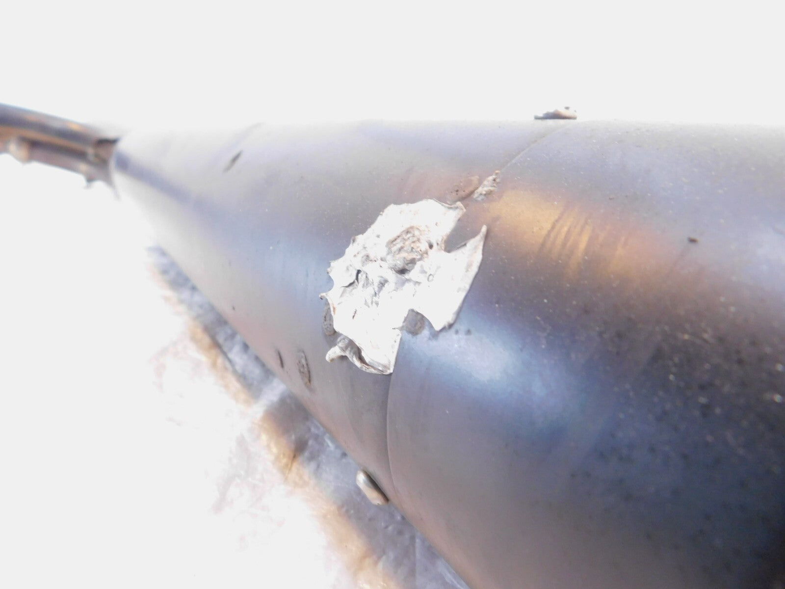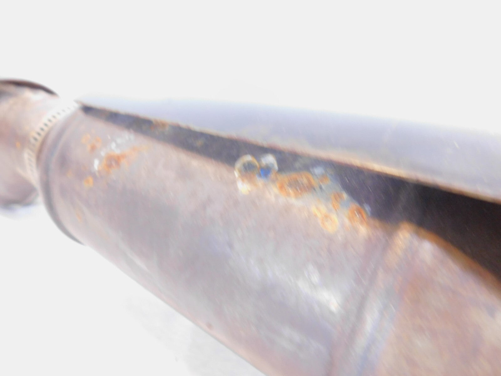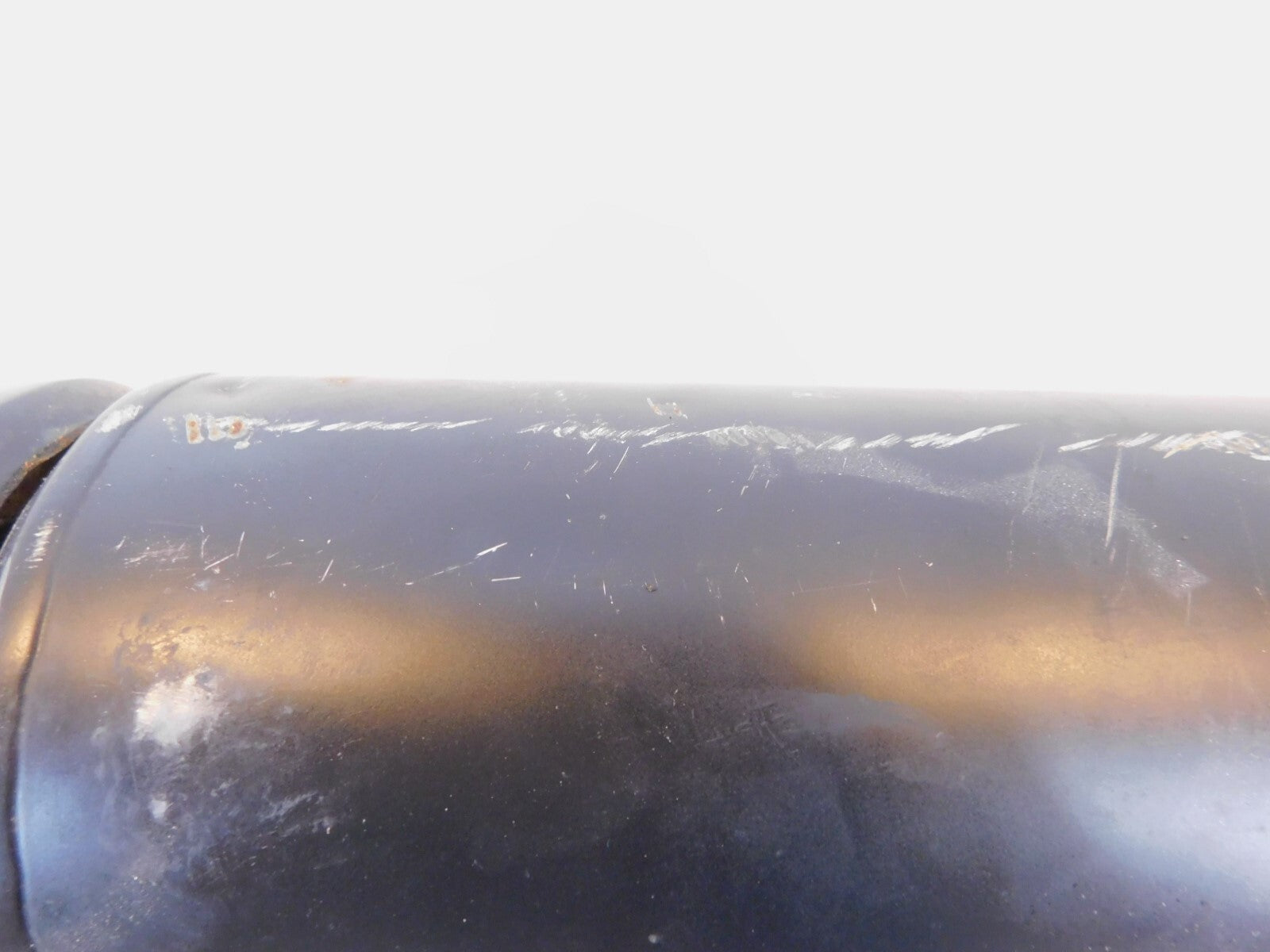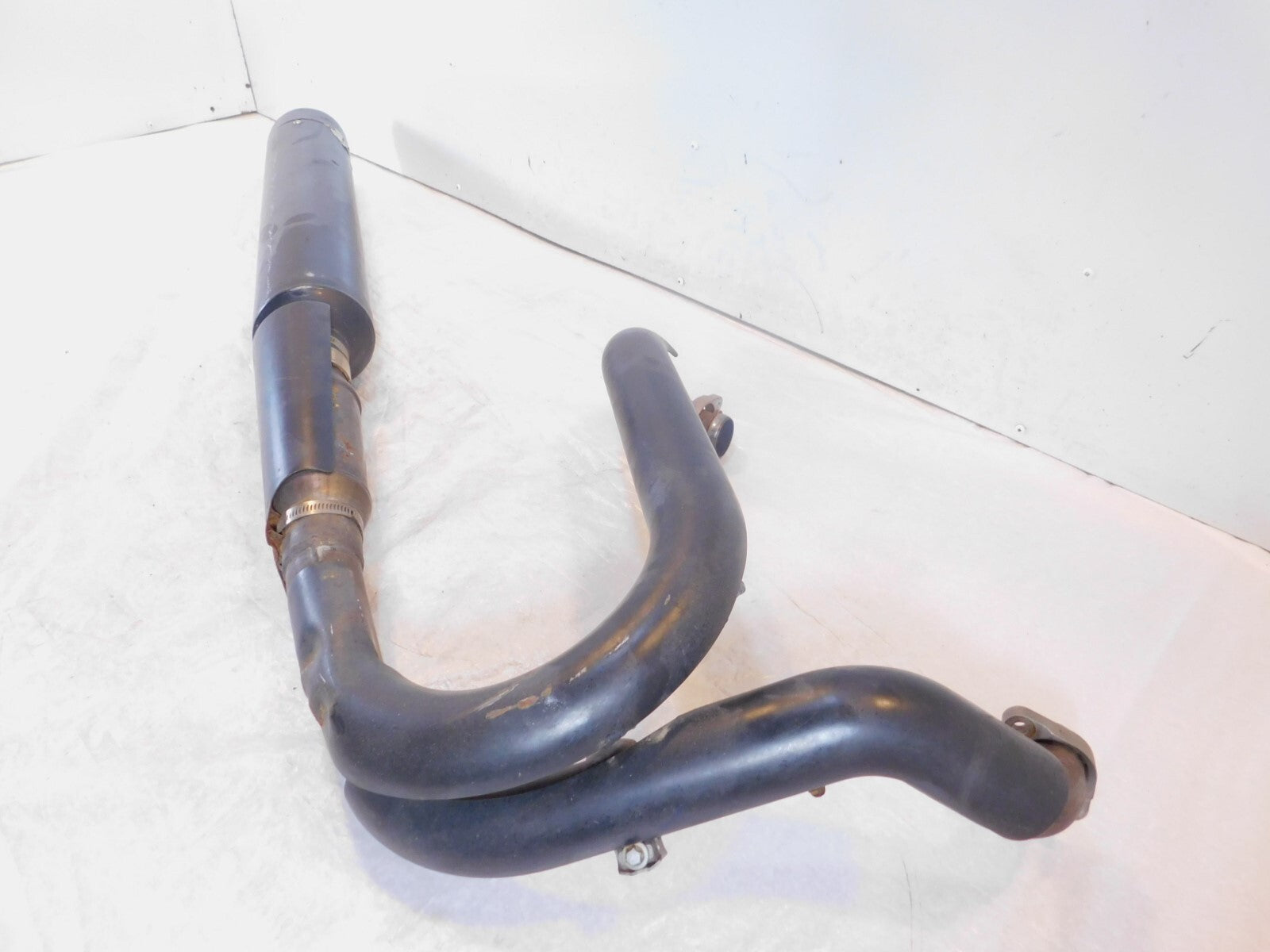This is a used set of header pipes. There are some marks from previous use and storage. They have a few scuff marks and some surface rust. The muffler also appears to be repaired near the end of the pipe (as pictured)