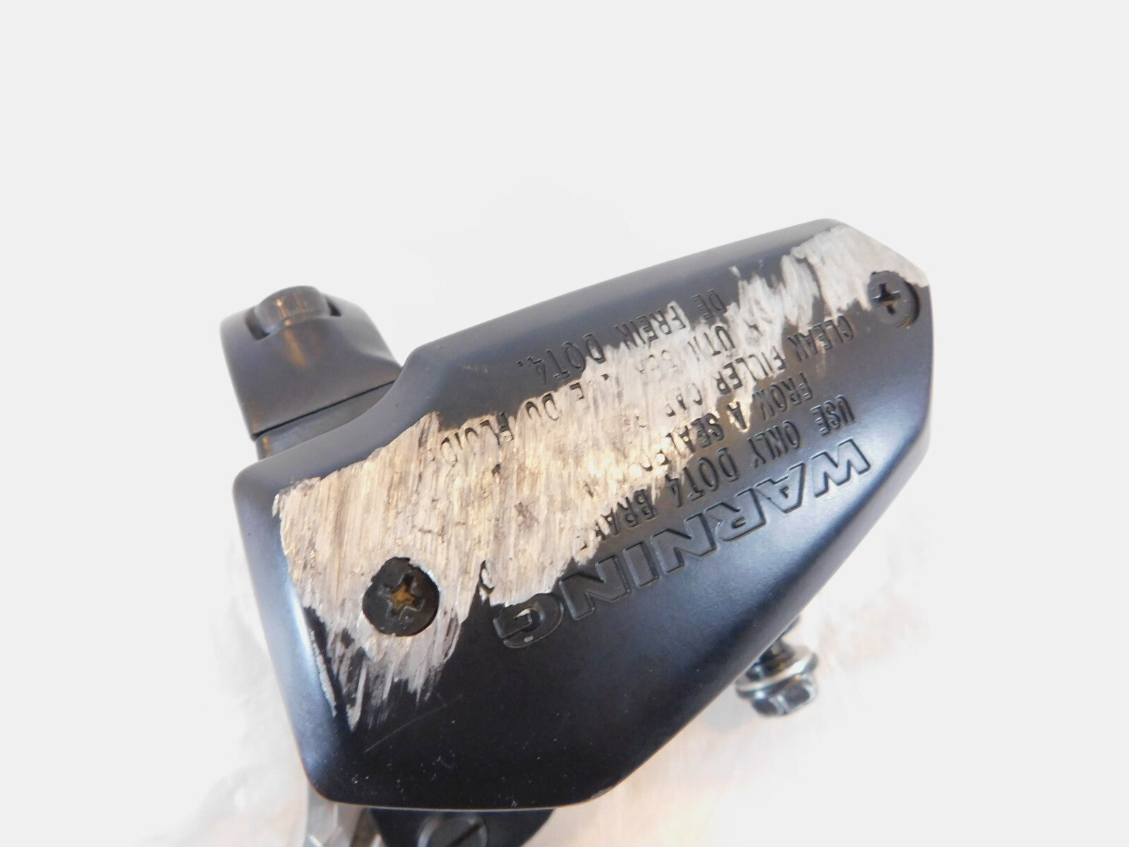 This is a used front master cylinder. It is a little dirty from previous use and storage and there is some significant road rash on the top (as pictured).