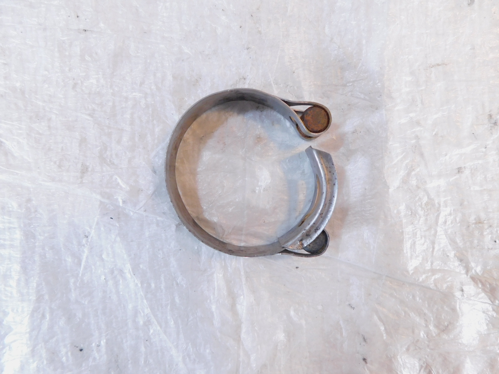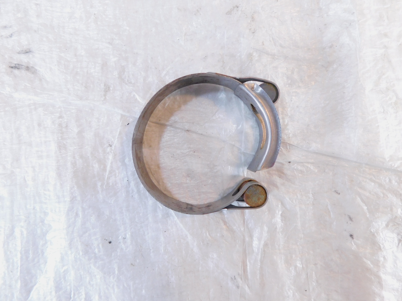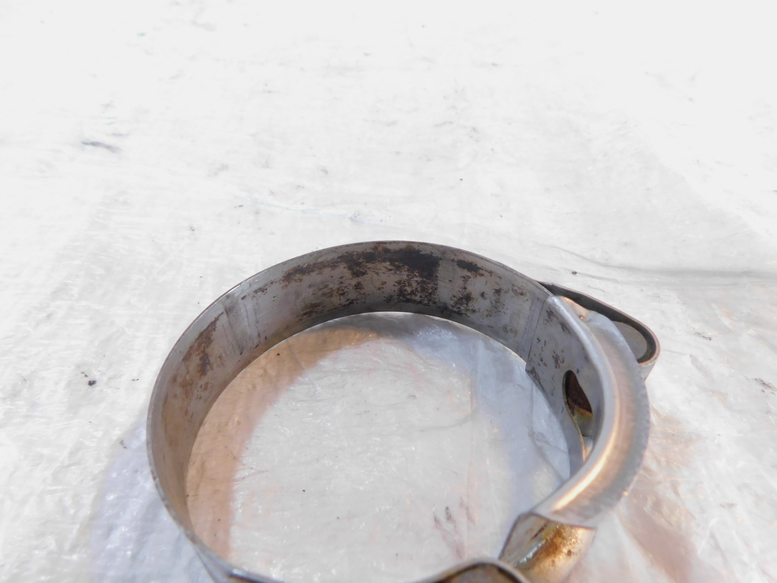 This is a used exhaust flange. It is dirty from previous use and storage and there are minor spots of pitting, scratching and discoloration (as pictured). The main bolt has also been removed (as pictured).