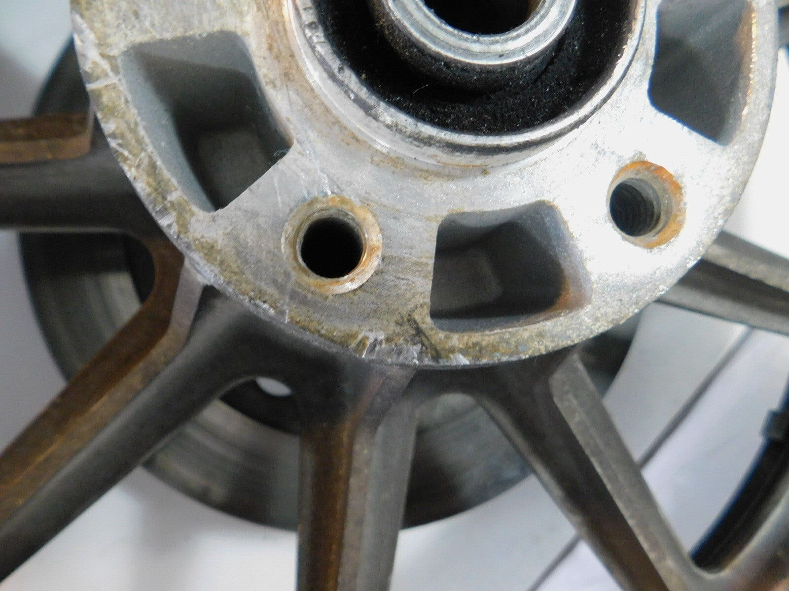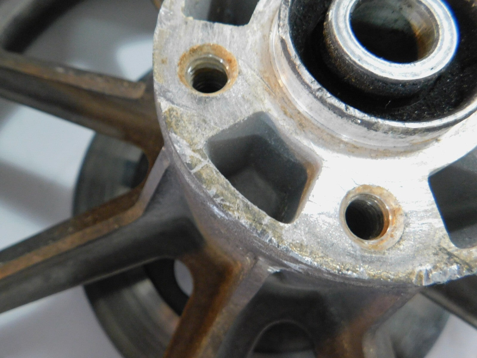 This is a used rear wheel. It is dirty and has some marks from previous use and storage. There is some slight discoloration (as pictured).