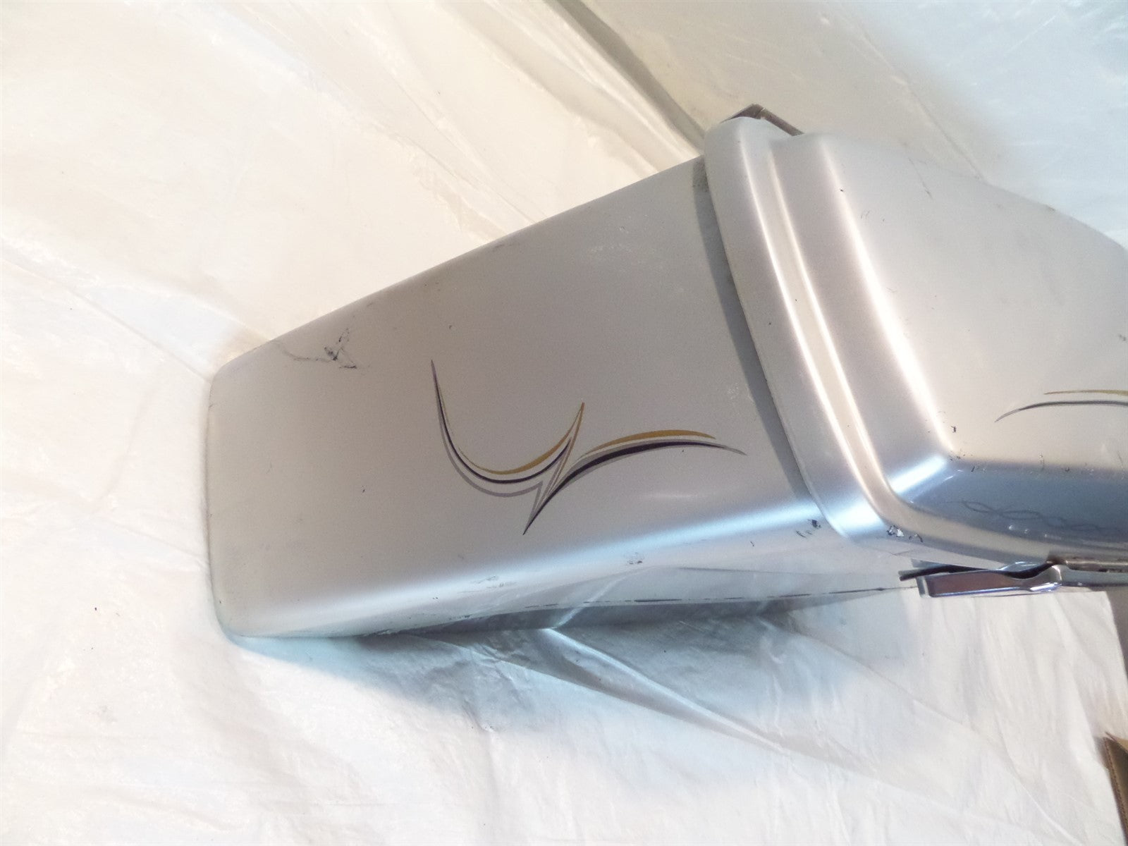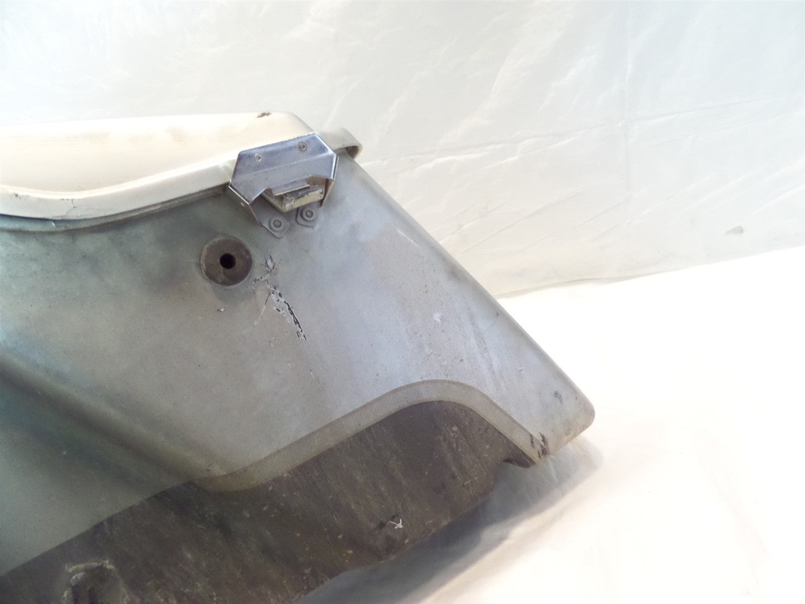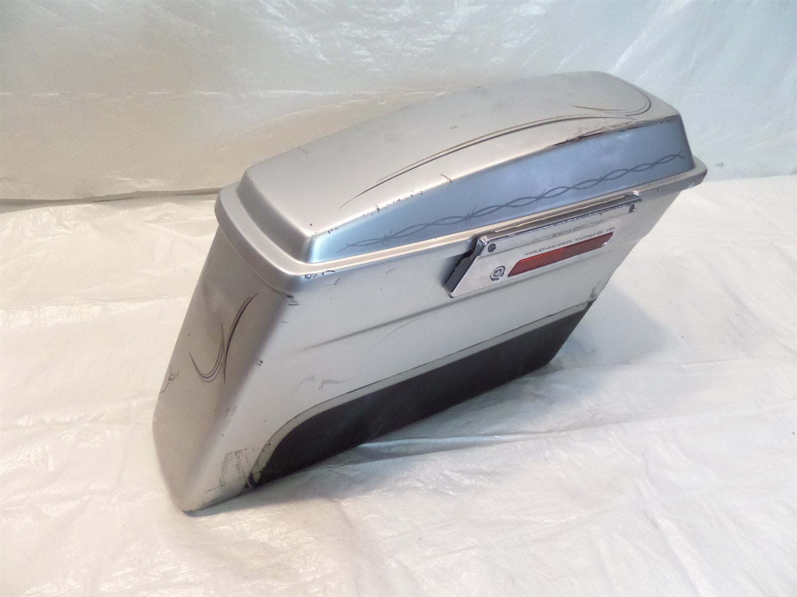 This is a used right saddlebag. There are some scuffs and a few scrapes on the front (as pictured). There is also a hole in the back. This is the silver that was used on 2003 Touring models for the 100th anniversary.