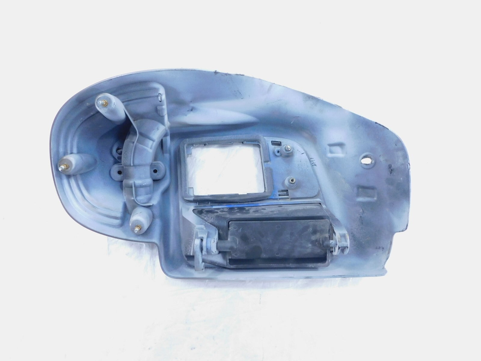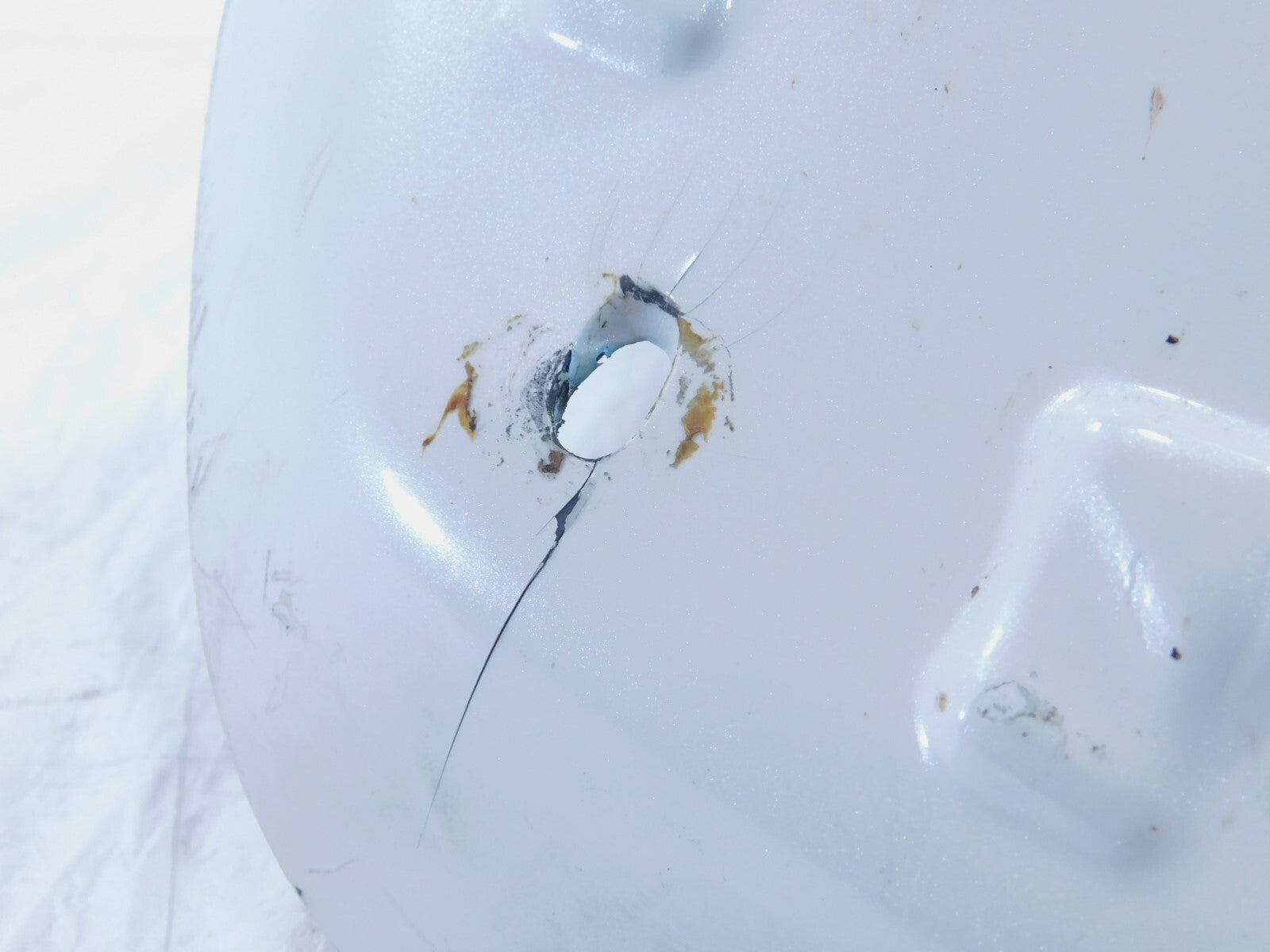 This is a used right lower fairing. There are marks from previous use and storage and scratches and scuffs in the paint and road rash. There are cracks in the piece.