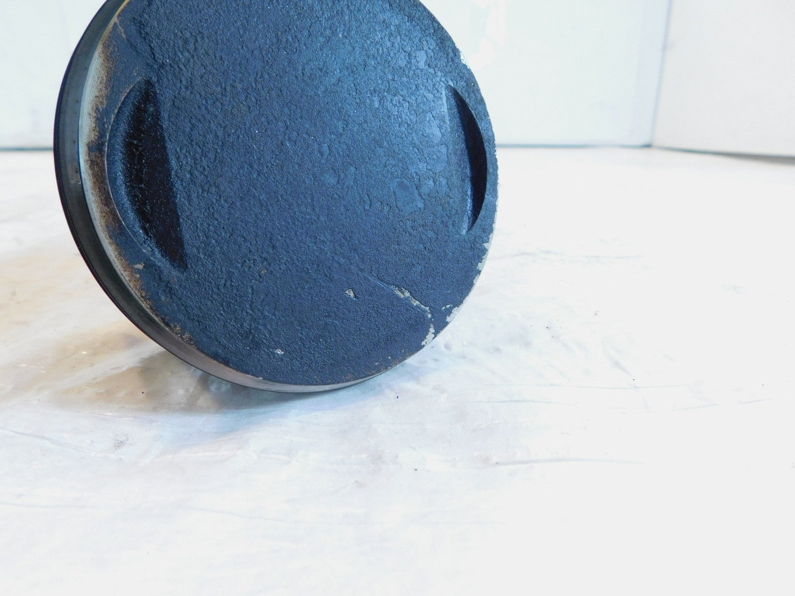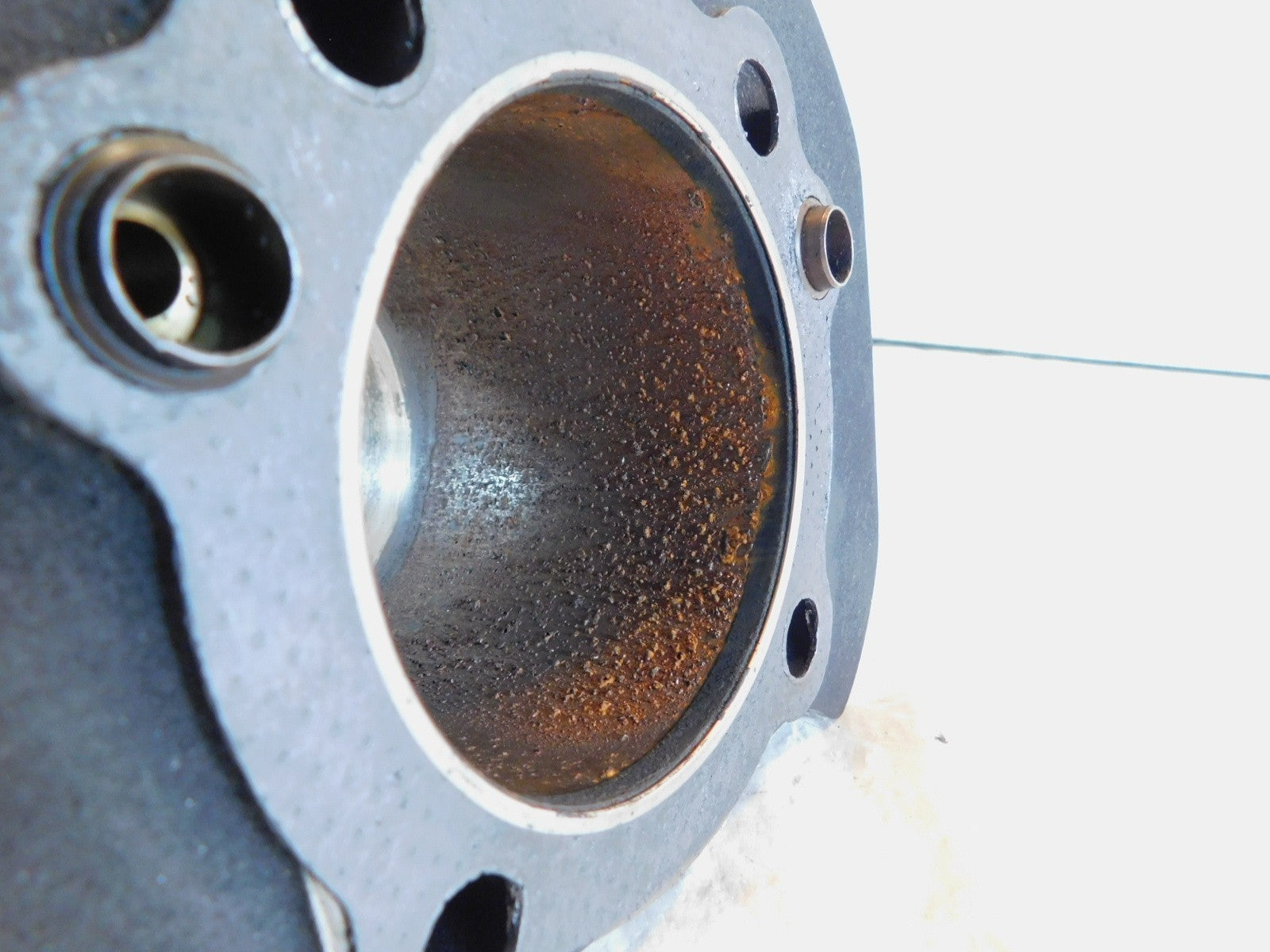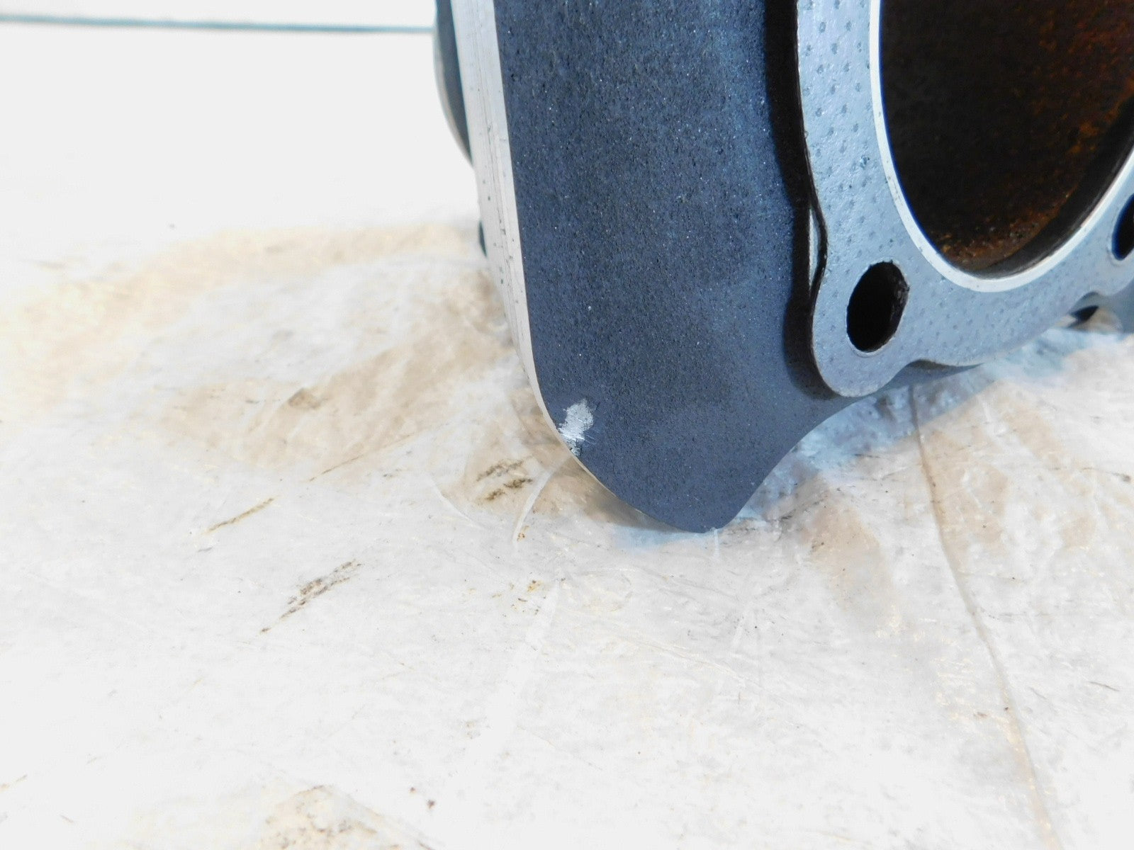 This is a used cylinder & piston. It is dirty and has some marks from previous use and storage. There is some discoloration in the material (as pictured). There are some nicks in the fins (as pictured). Due to burn damage there is heavy buildup on the inside of the jug (as pictured).