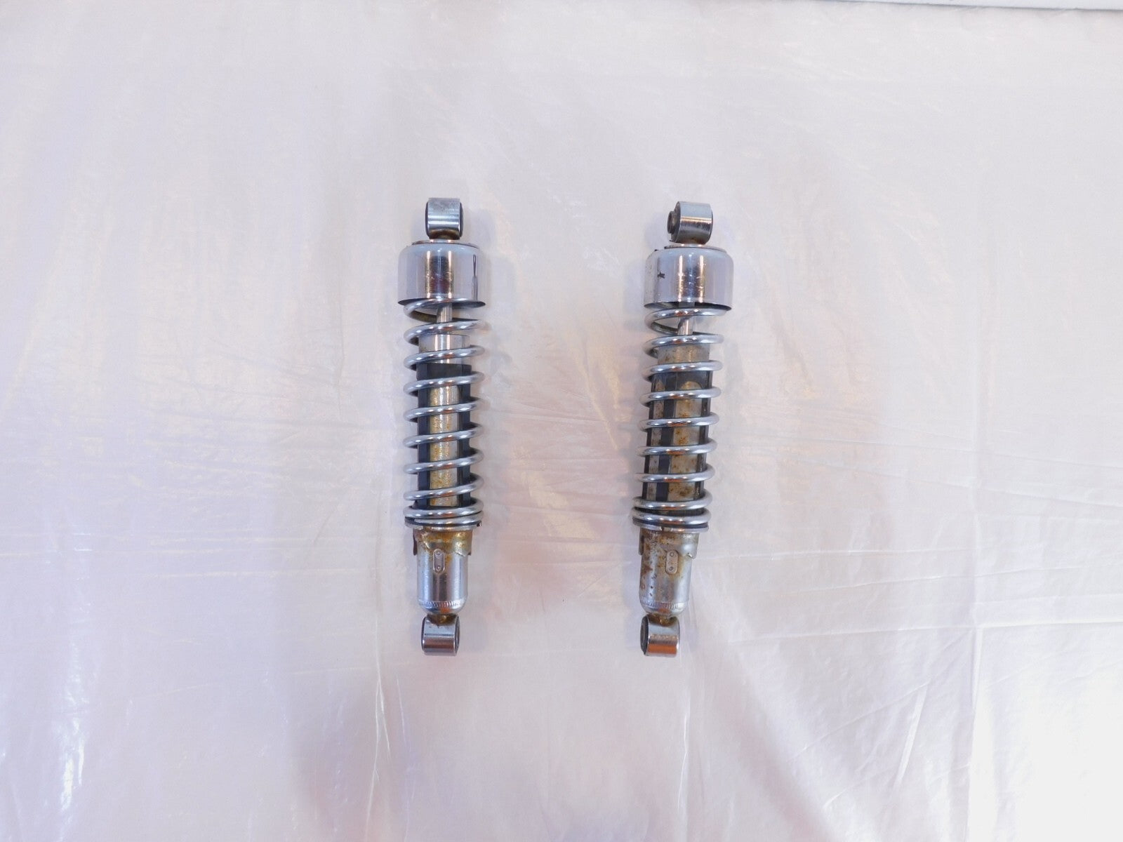 This is a used pair of Sportster shocks. They are a little dirty and they have some marks from previous use and storage. There is some surface rust, pitting, and scratches in the material (as pictured). These shocks measure 12 inches eye to eye.