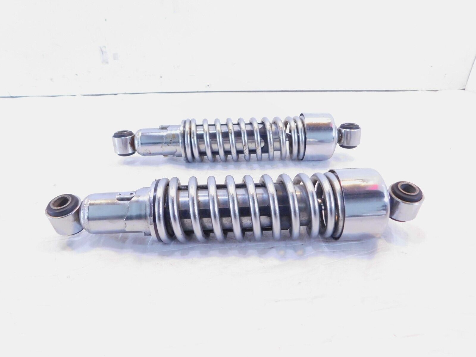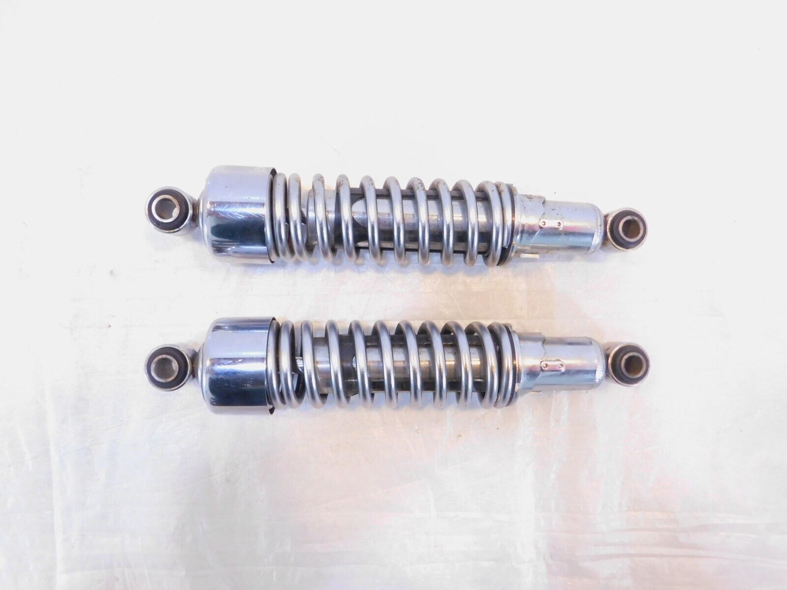 This is a used shock absorber. It is a little dirty and has some marks from previous use and storage. There is a dent, some rash, and pitting in the chrome (as pictured). Center to Center Measurement is 12".