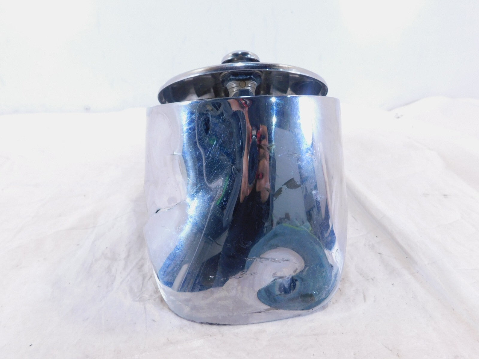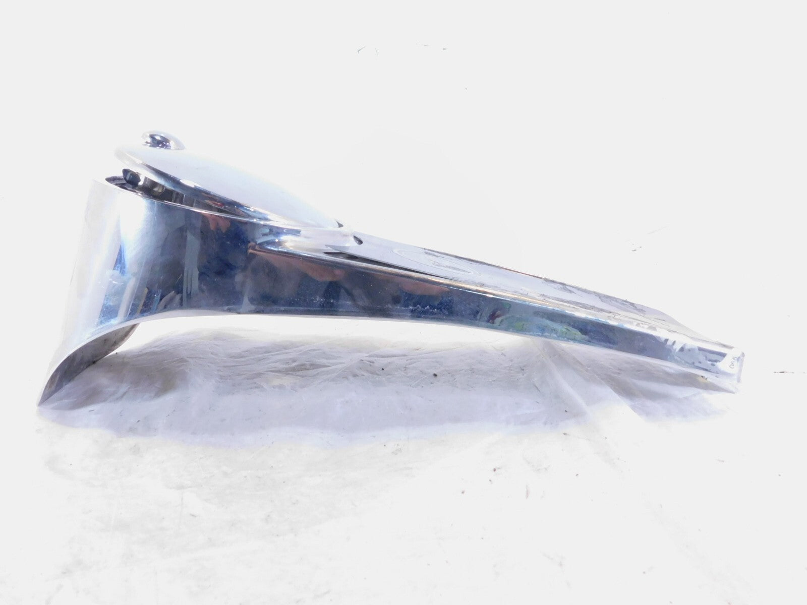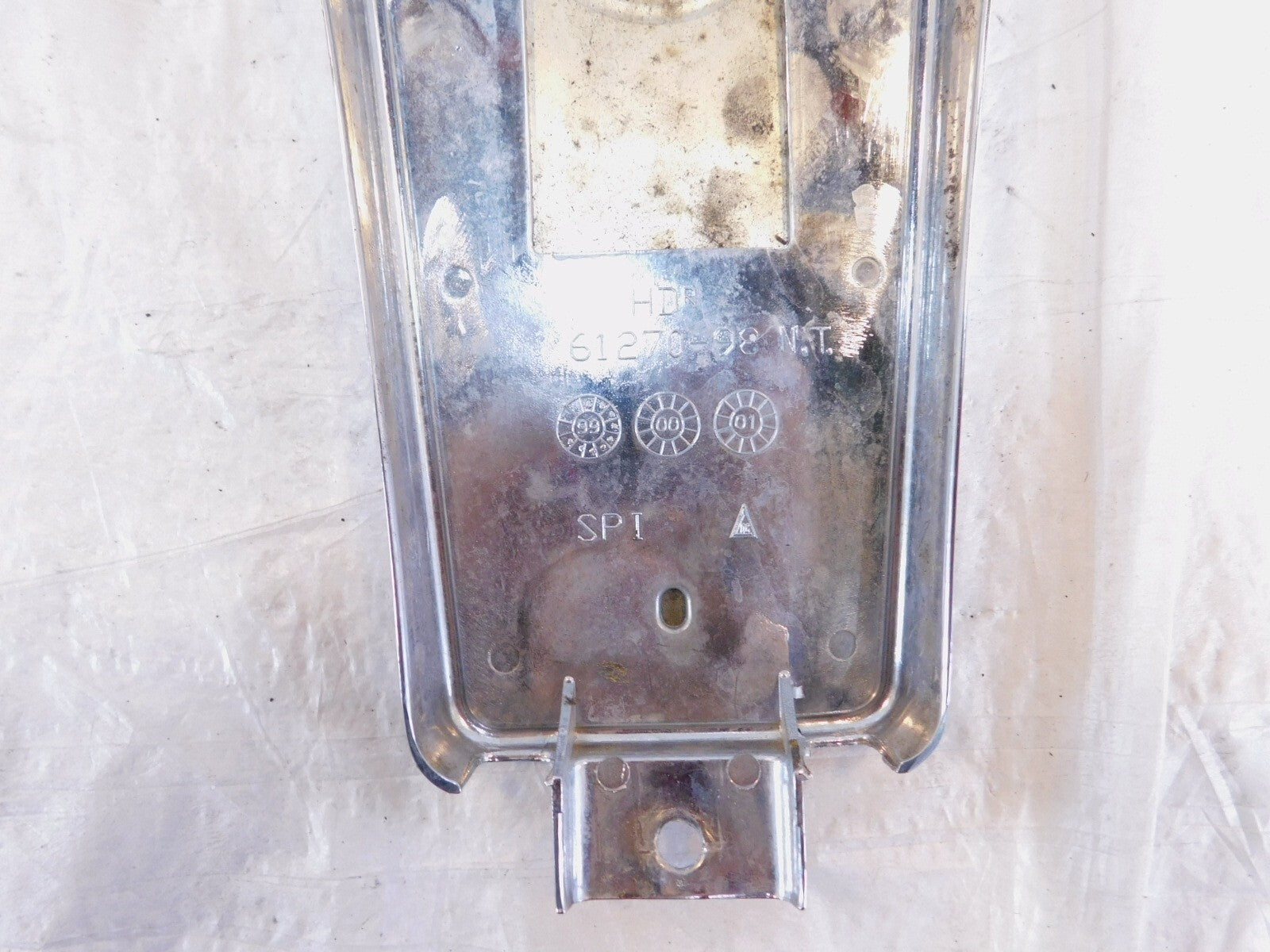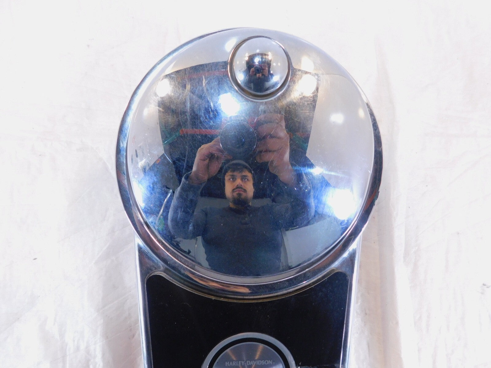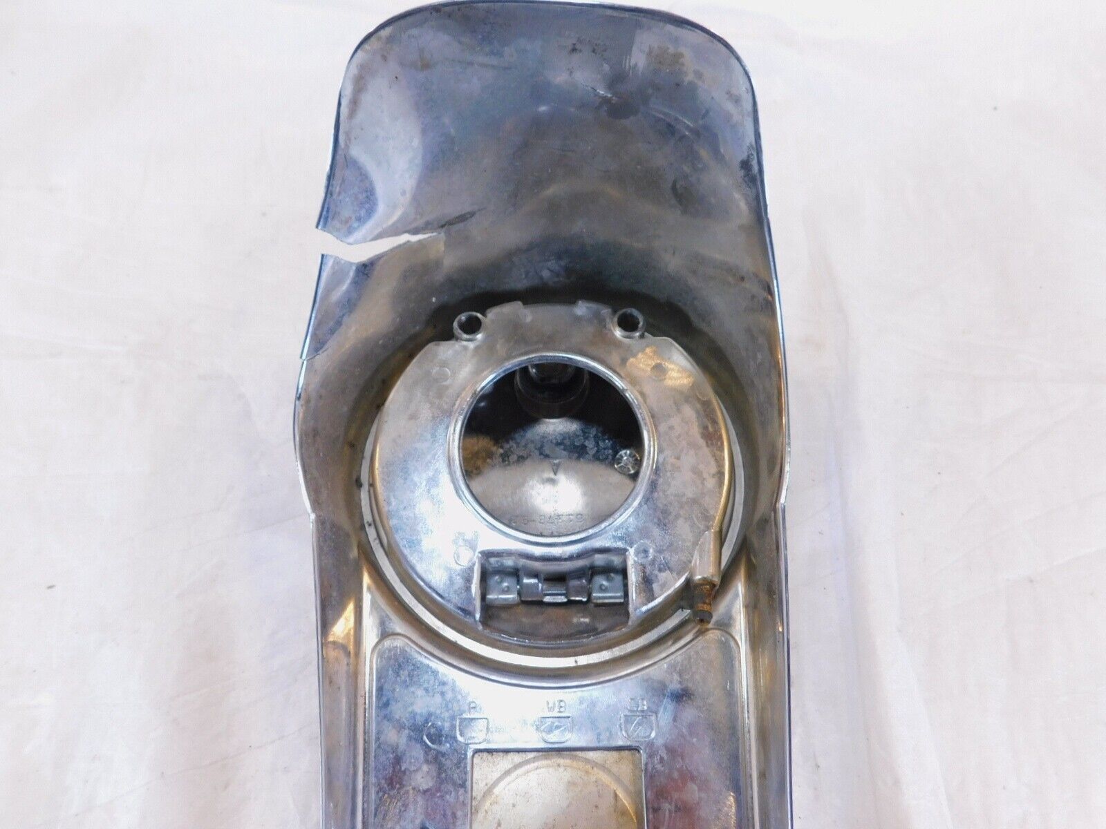 This is a used fuel tank console. It is a little dirty and has some marks from previous use and storage. There are some surface scratches in the chrome (as pictured). There is a large crack on the top end of the console and a smaller crack on the other end of the console (as pictured).