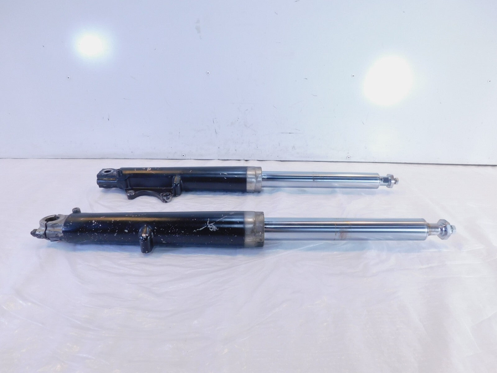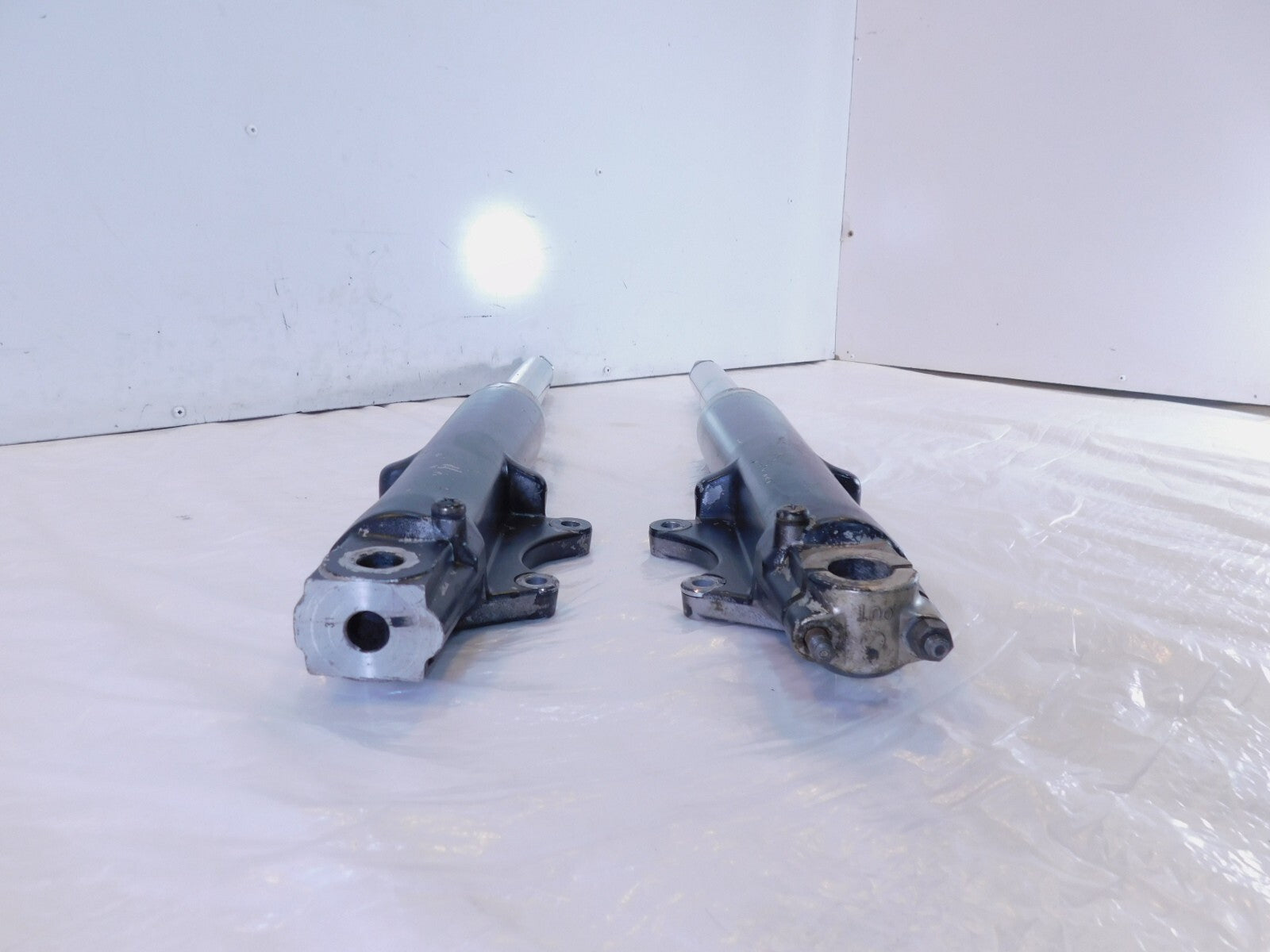 This is a used set of front forks. There are some marks and they are dirty from previous use and storage. They have some pitting, scratches, and chipping in the finish (as pictured).