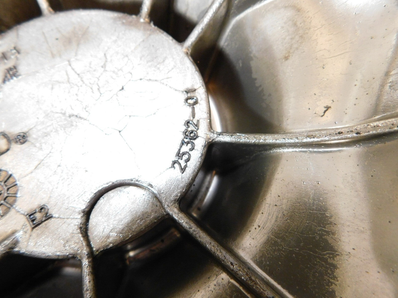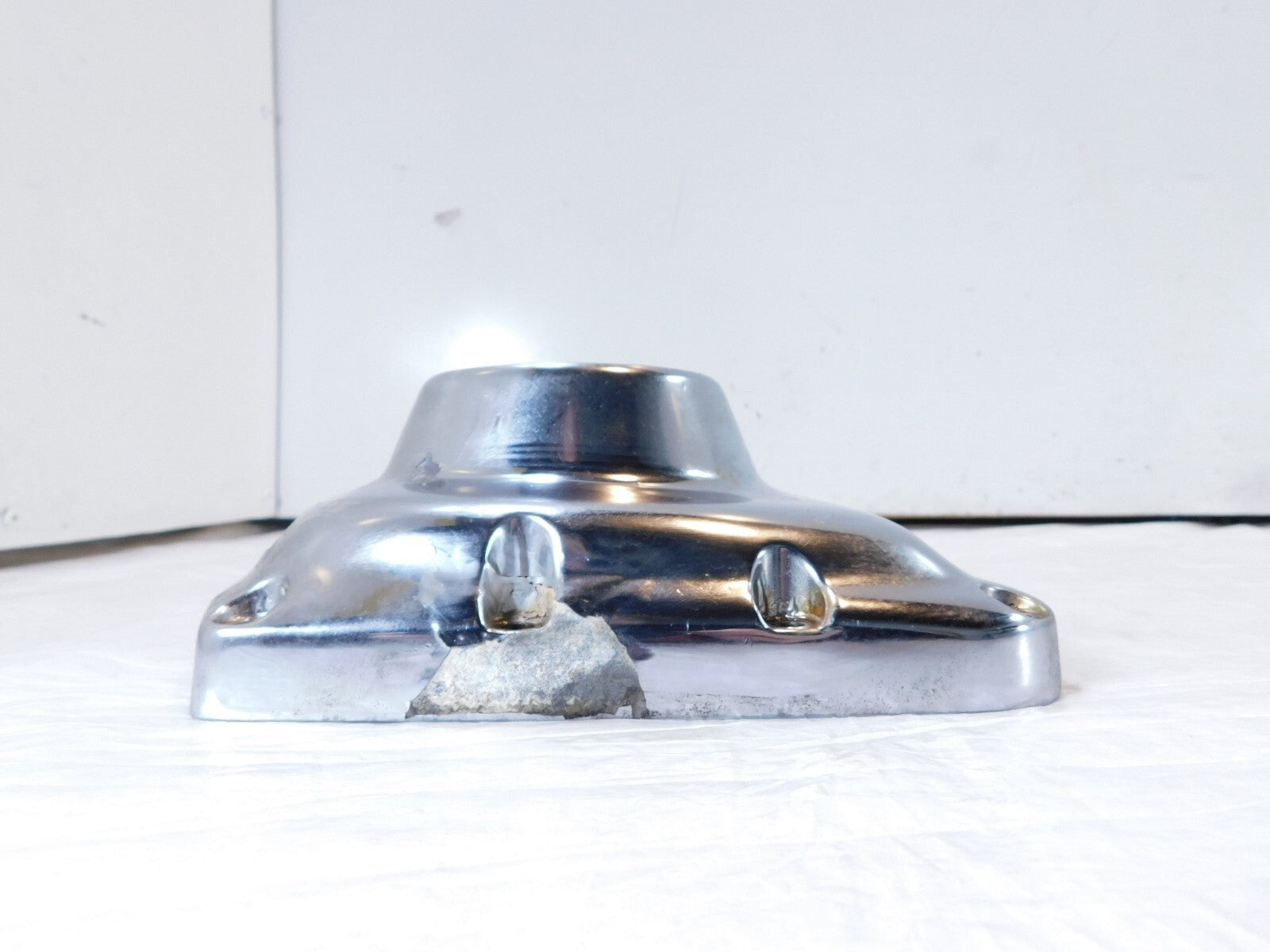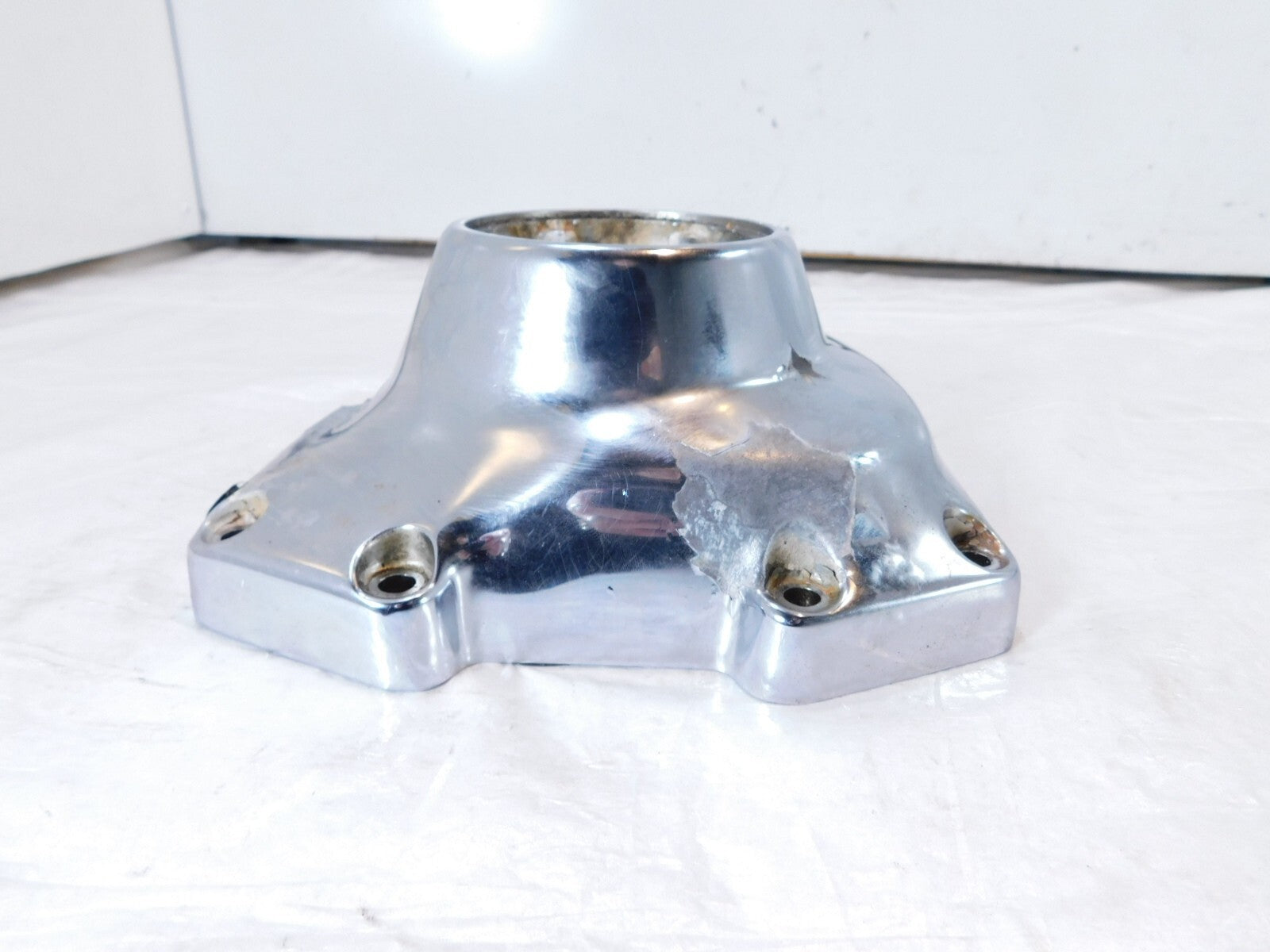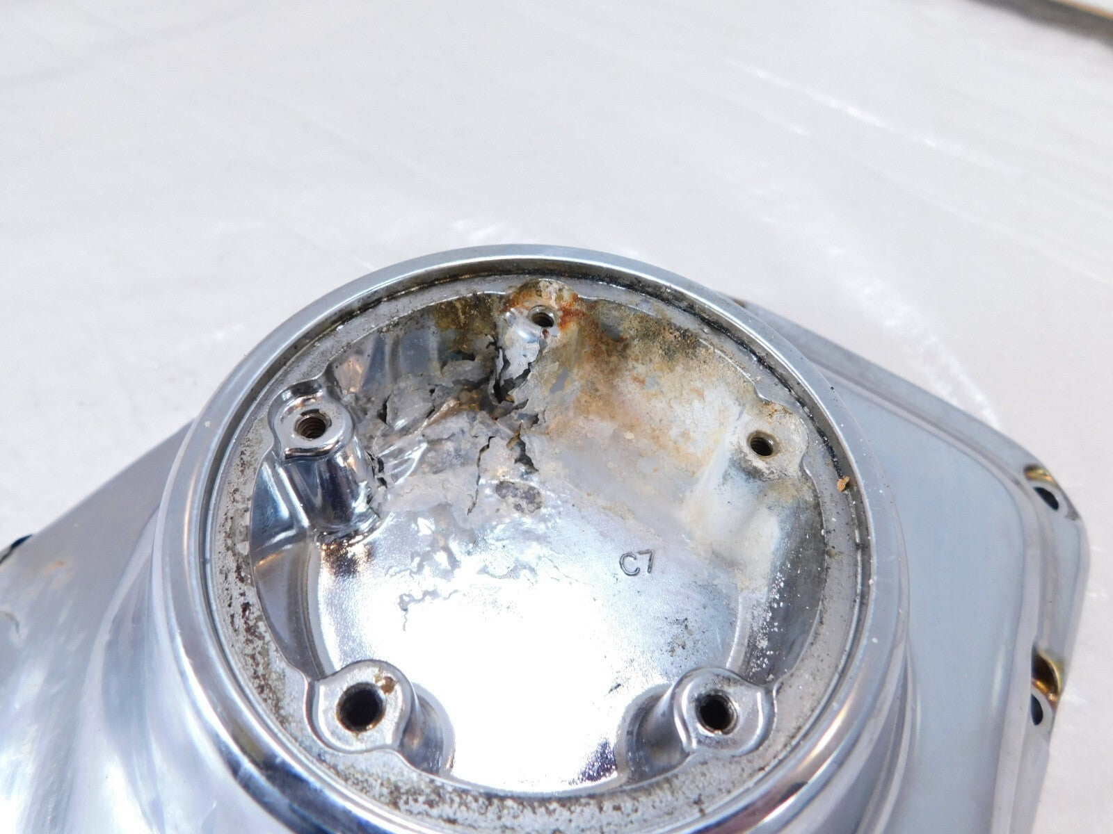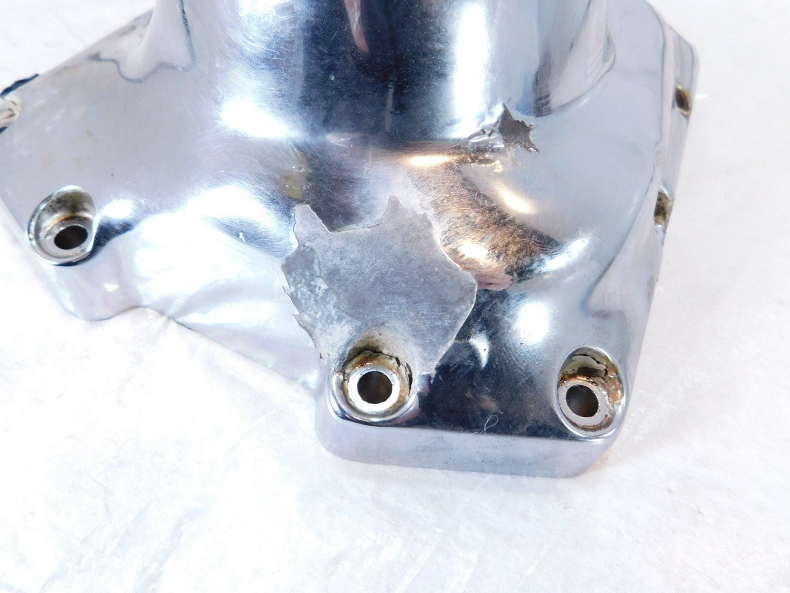 This is a used cam gear cover. It is dirty and has some marks from previous use and storage. There are some surface scratches and some heavy chipping in the chrome. There is some discoloration on the underside (as pictured).