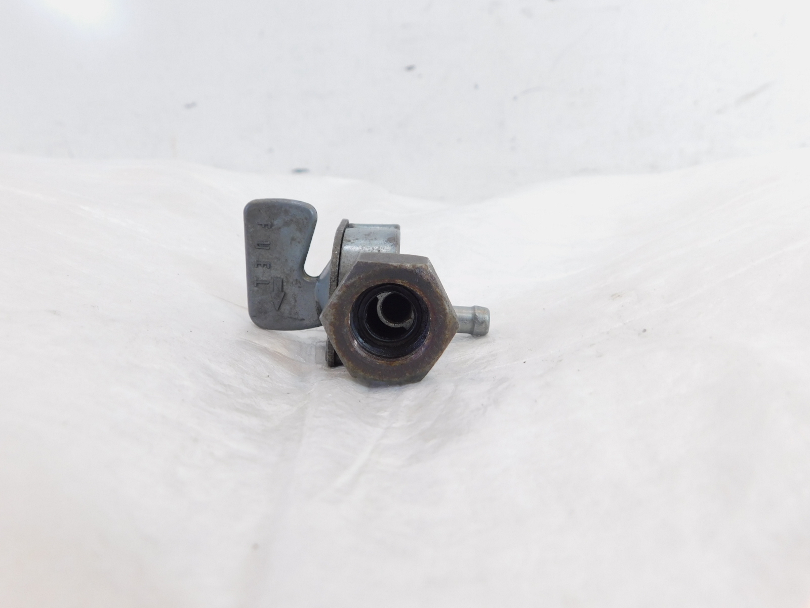 This is a used petcock body. It is a bit dirty and has marks from previous use and storage as well as some discoloration (as pictured).