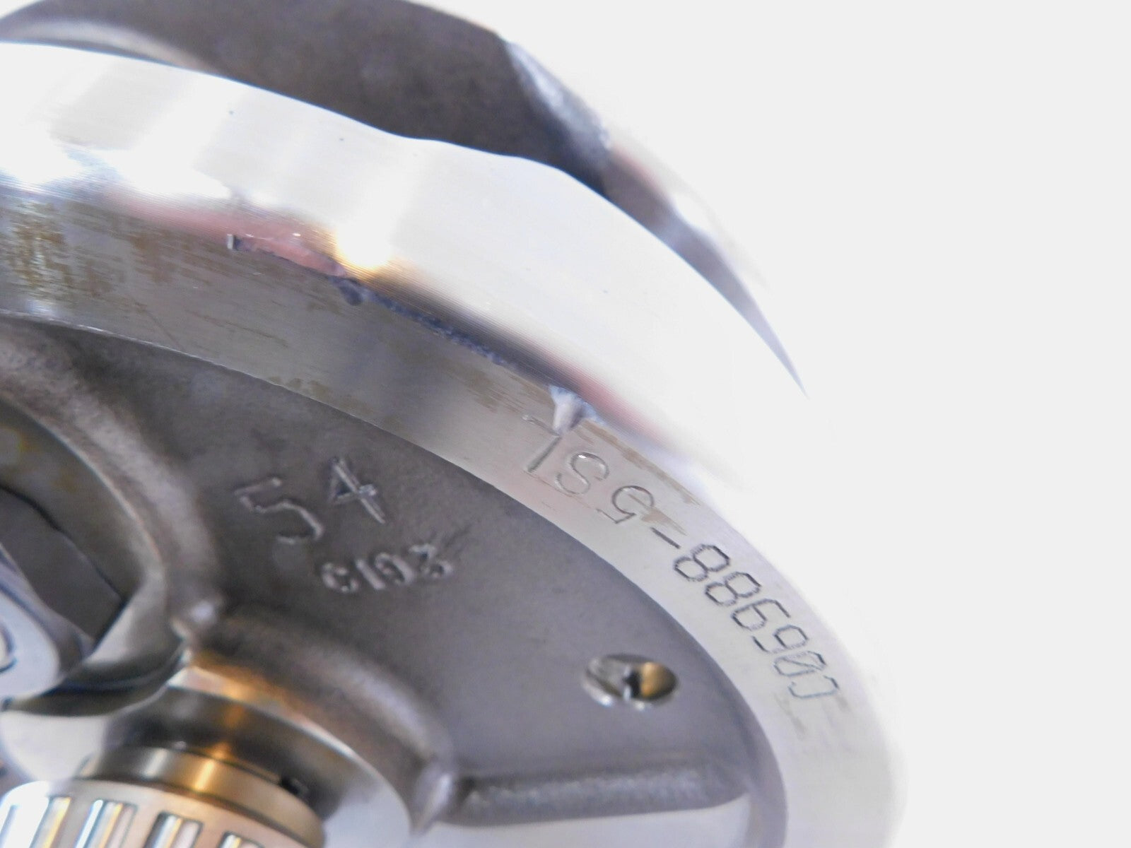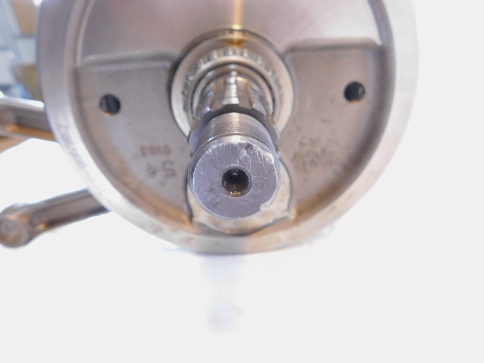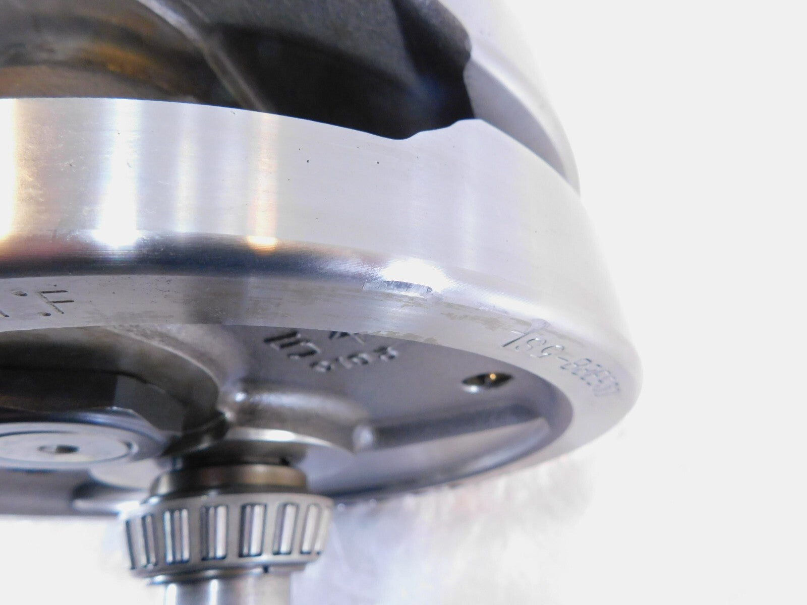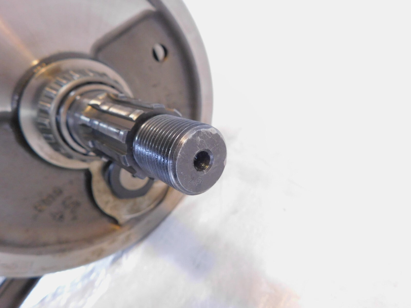 This is a used crankshaft. It is a little dirty from previous use. There are some nicks and dents along the edge of the crank. The ends of the gear shaft also have some damage along with a bit of mushrooming (as pictured)