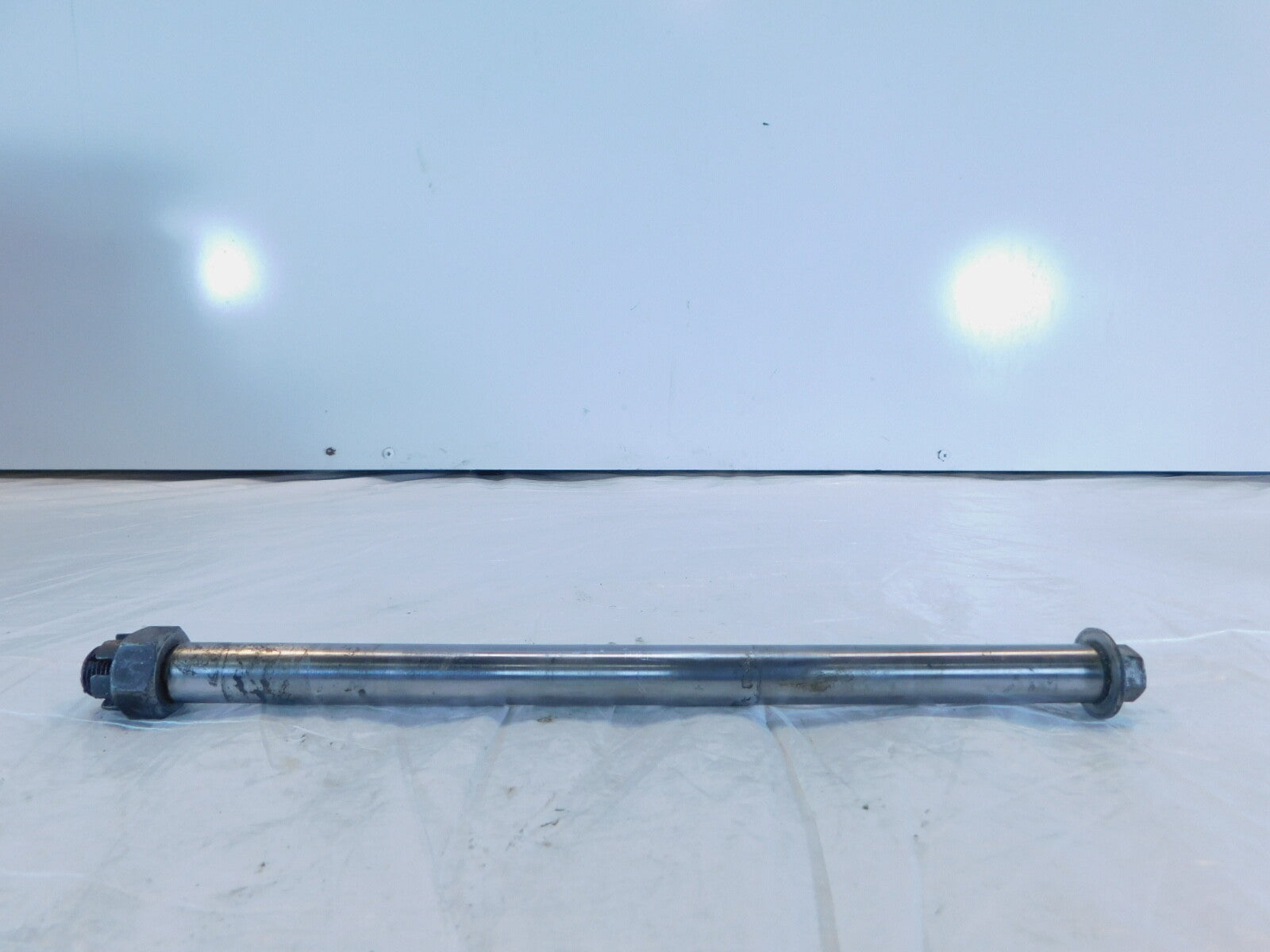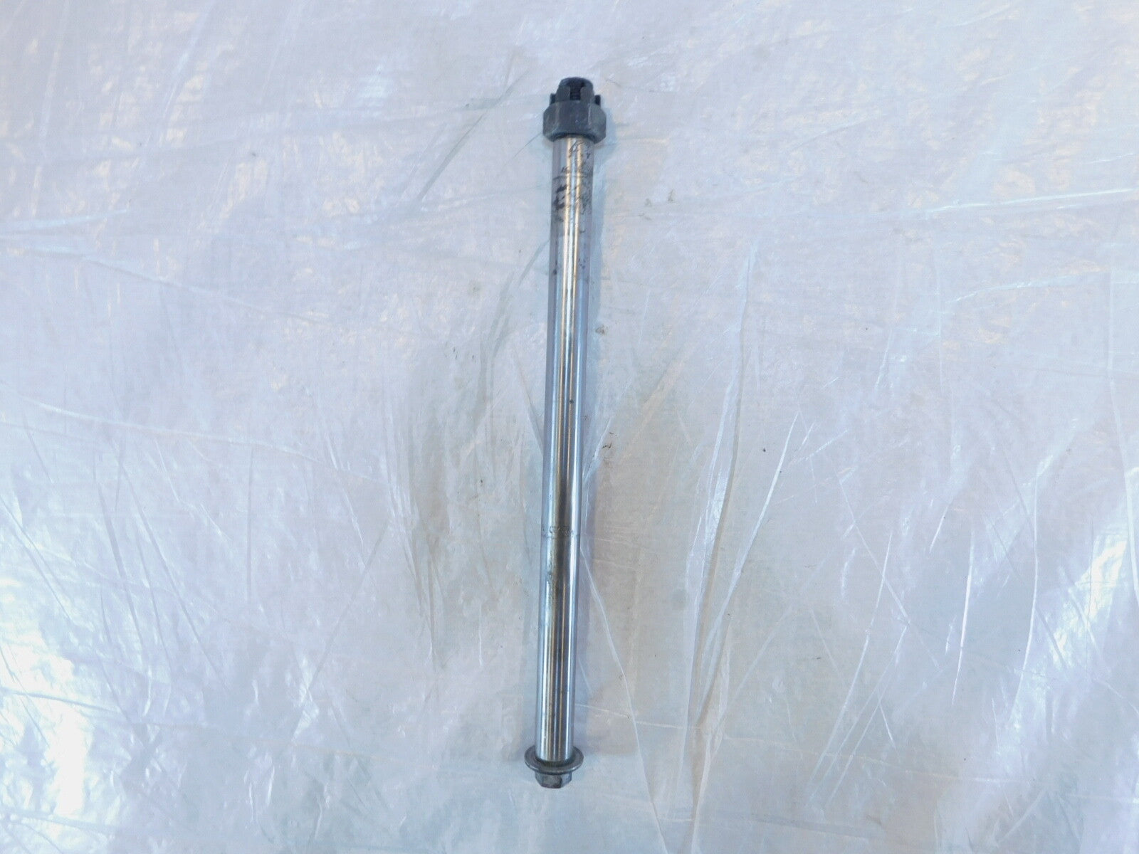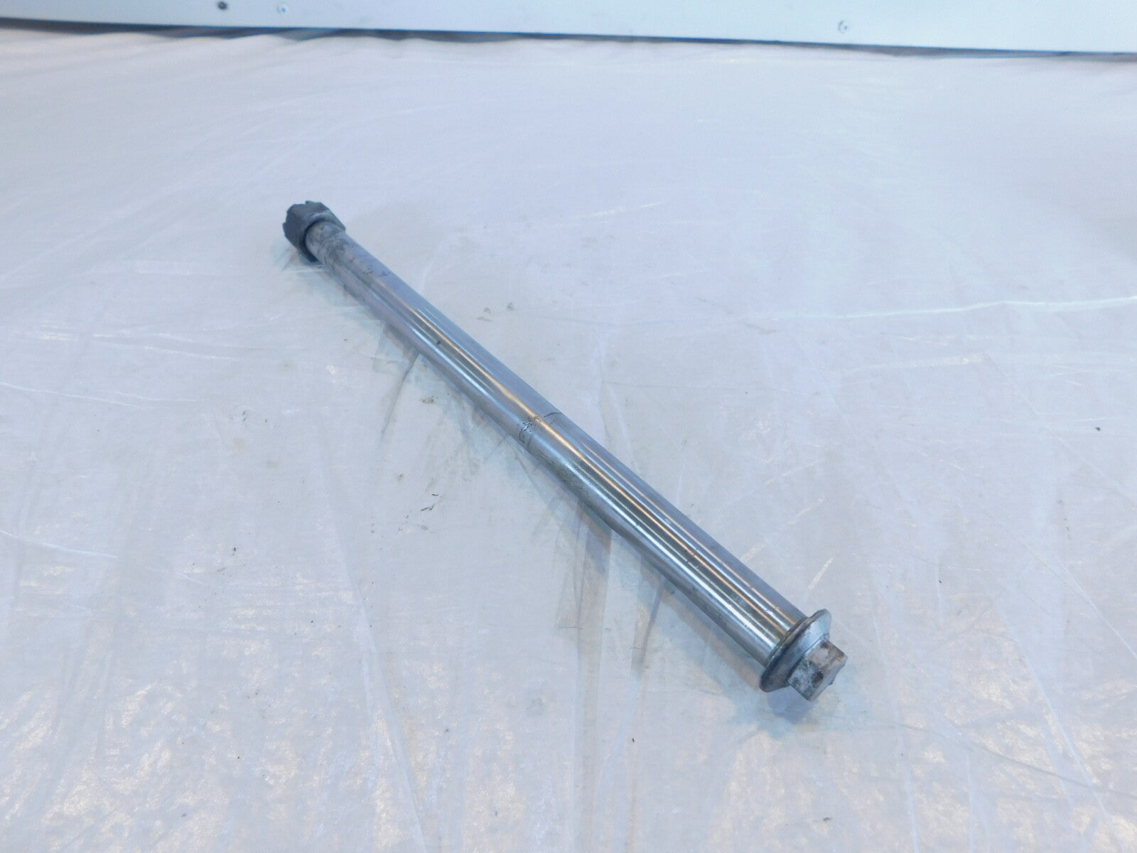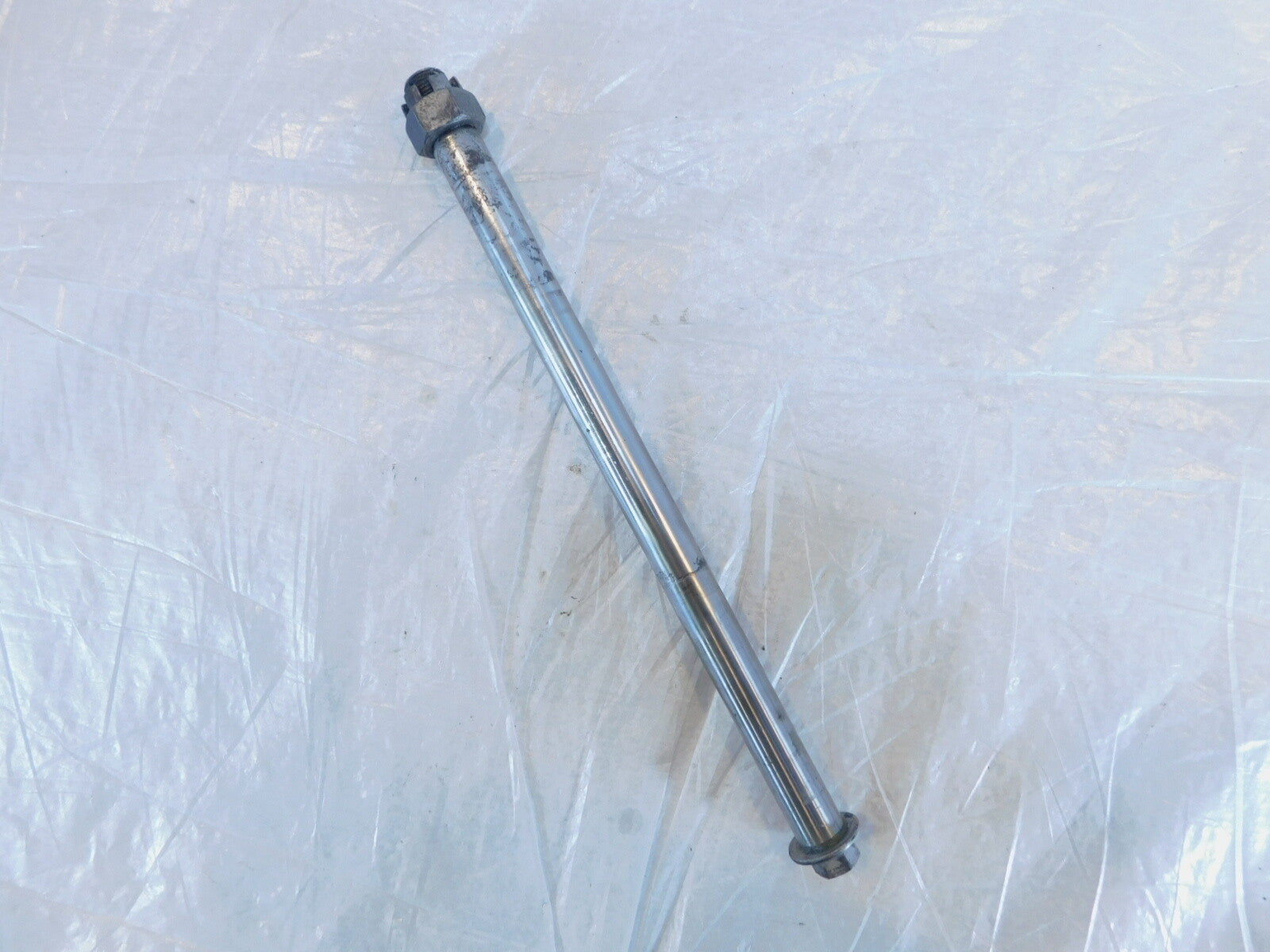 This is a used rear wheel axle in good condition. It has some light marks from previous use and it is a little dirty but looks good.