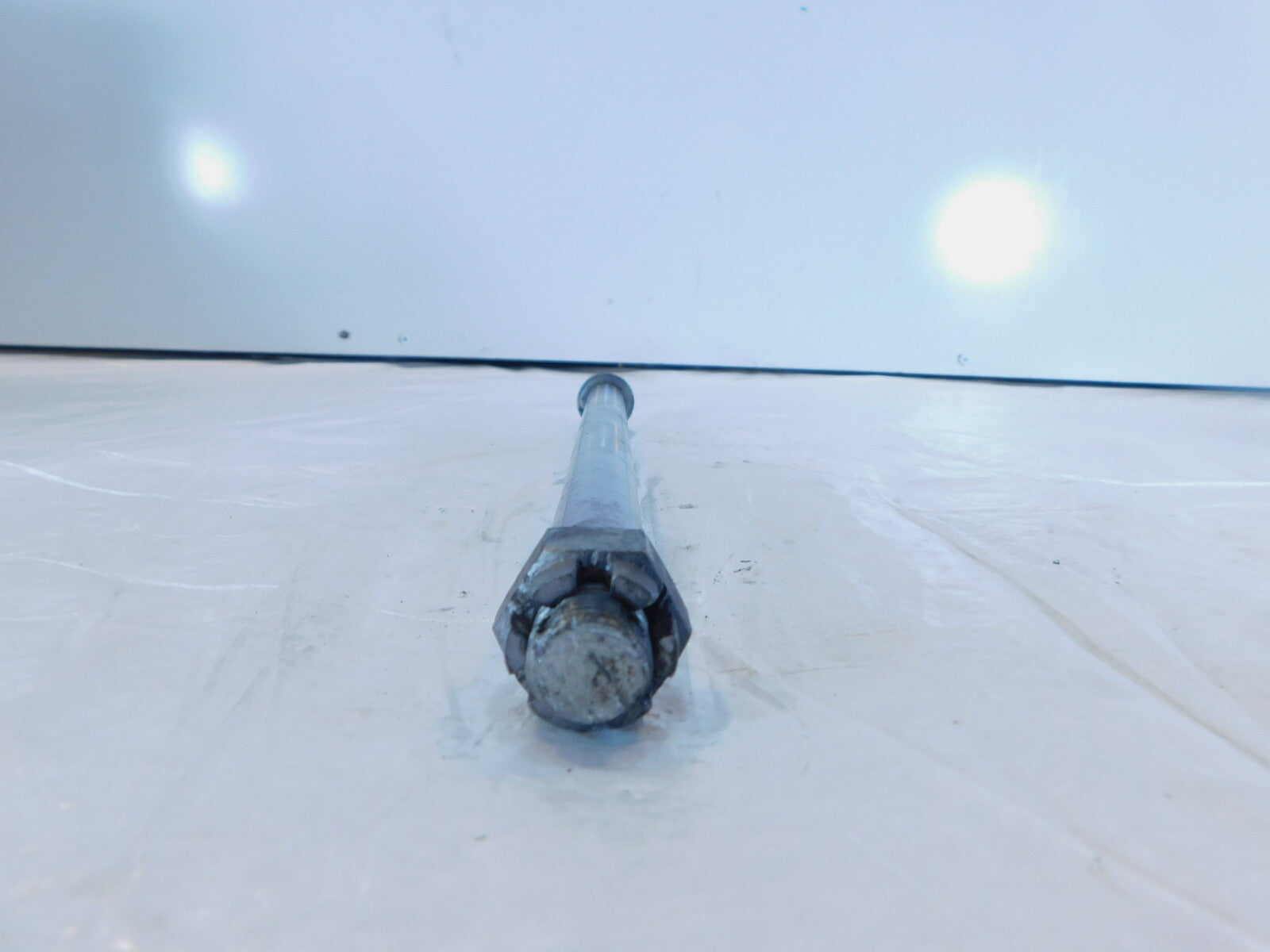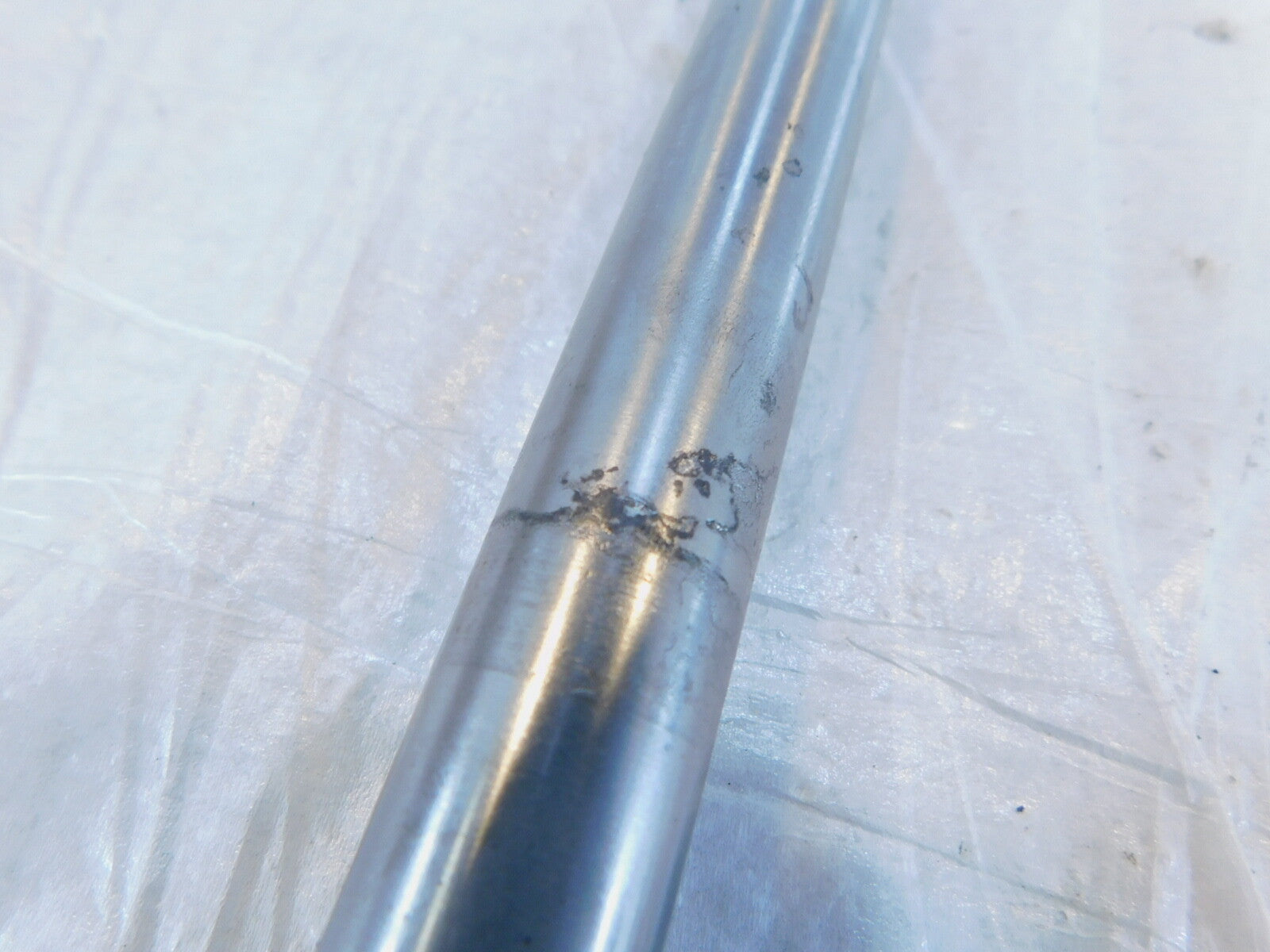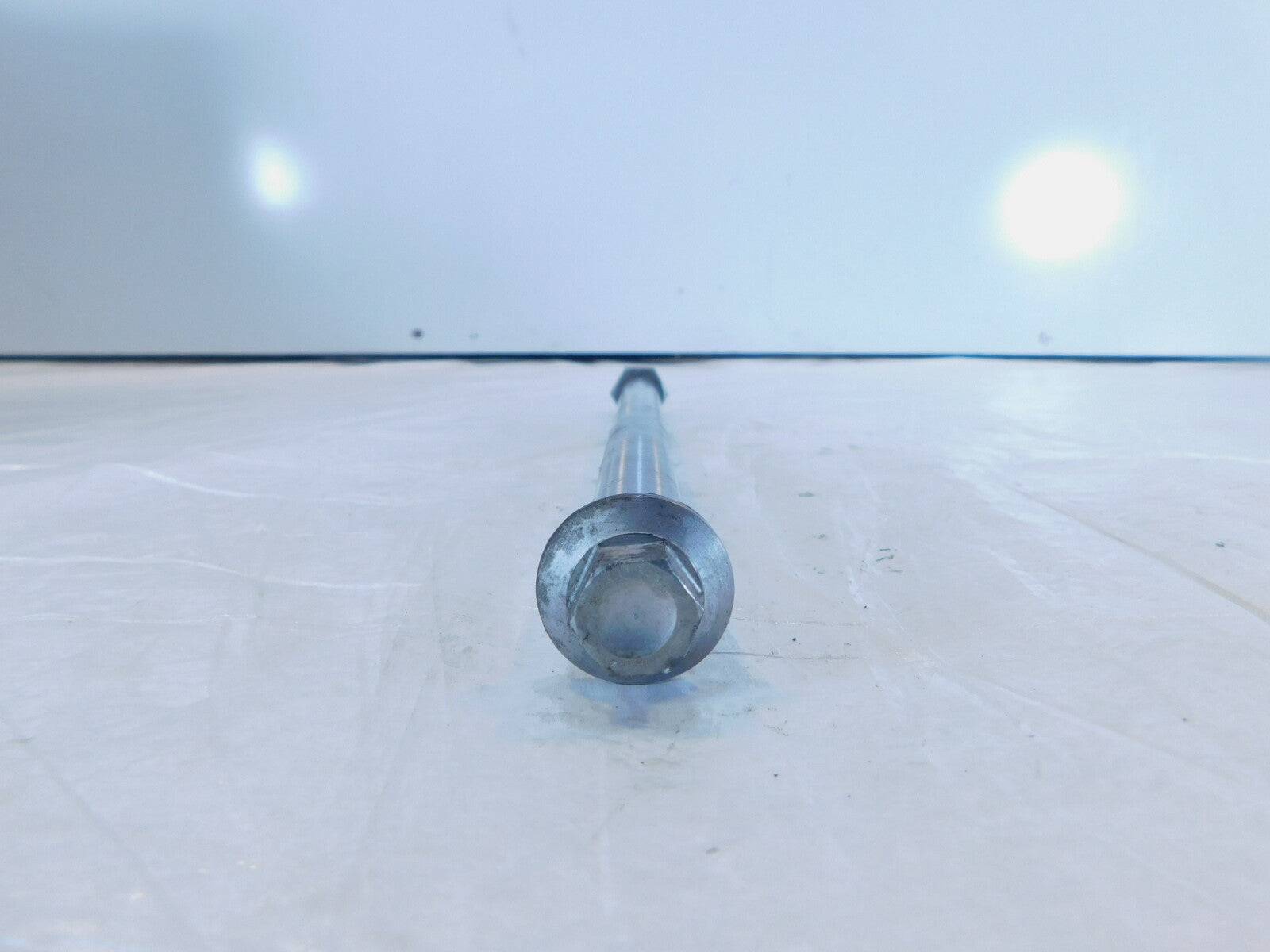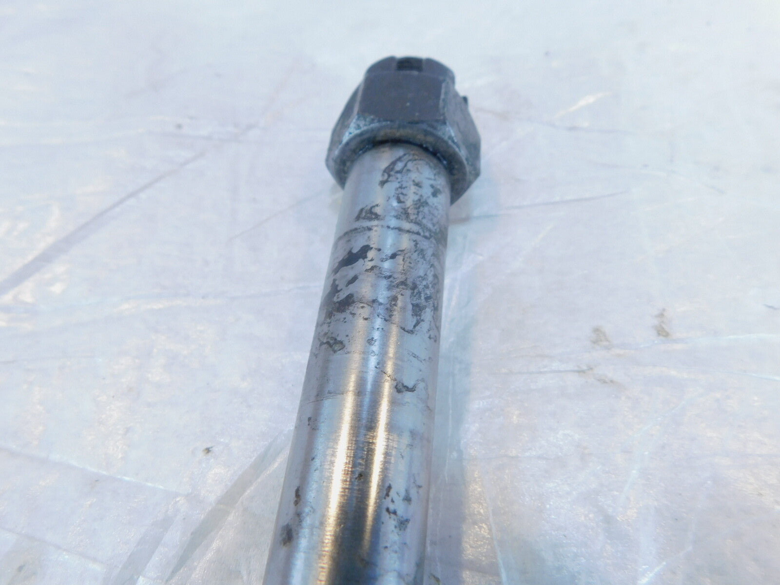 This is a used rear wheel axle in good condition. It has some light marks from previous use and it is a little dirty but looks good.
