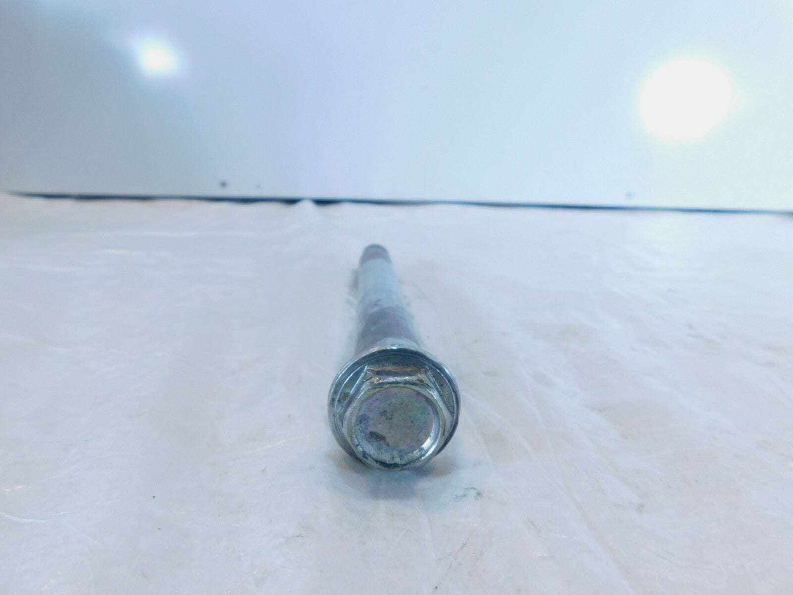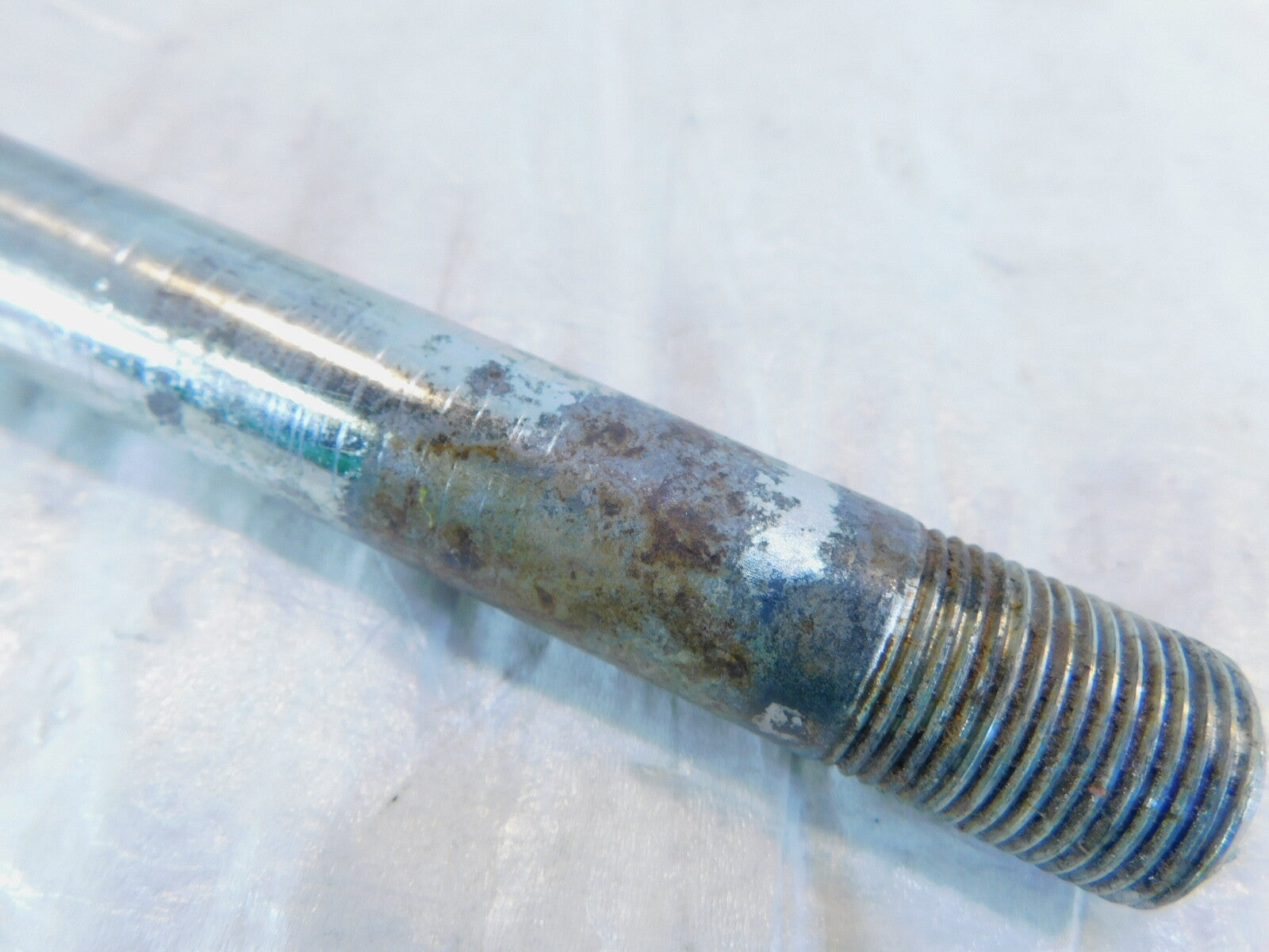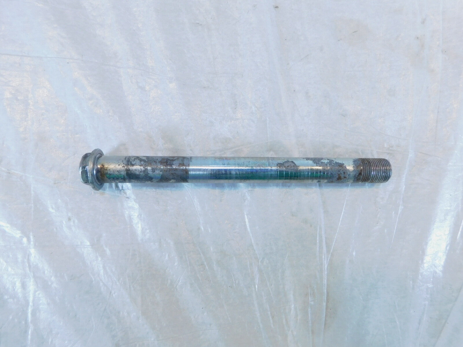 This is a used swing arm pivot bolt in good condition. It has some light marks and is a little dirty from previous use and storage and has some light rust (as pictured).