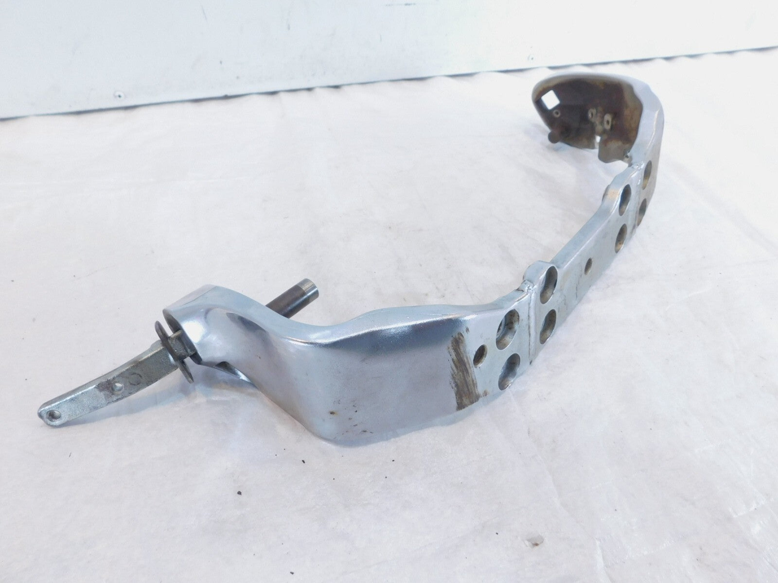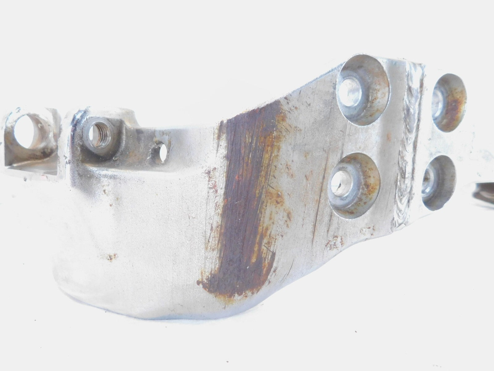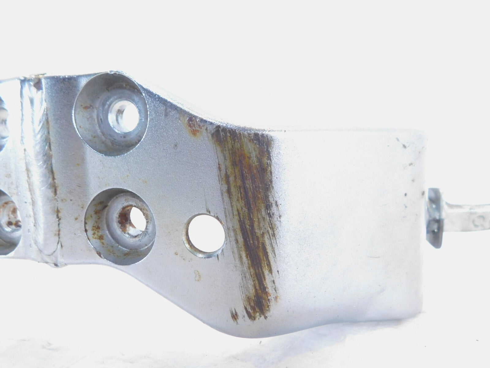 This is a used front footpeg bracket. It is a little dirty from previous use and storage and there are some spots of surface rust and rash (as pictured).