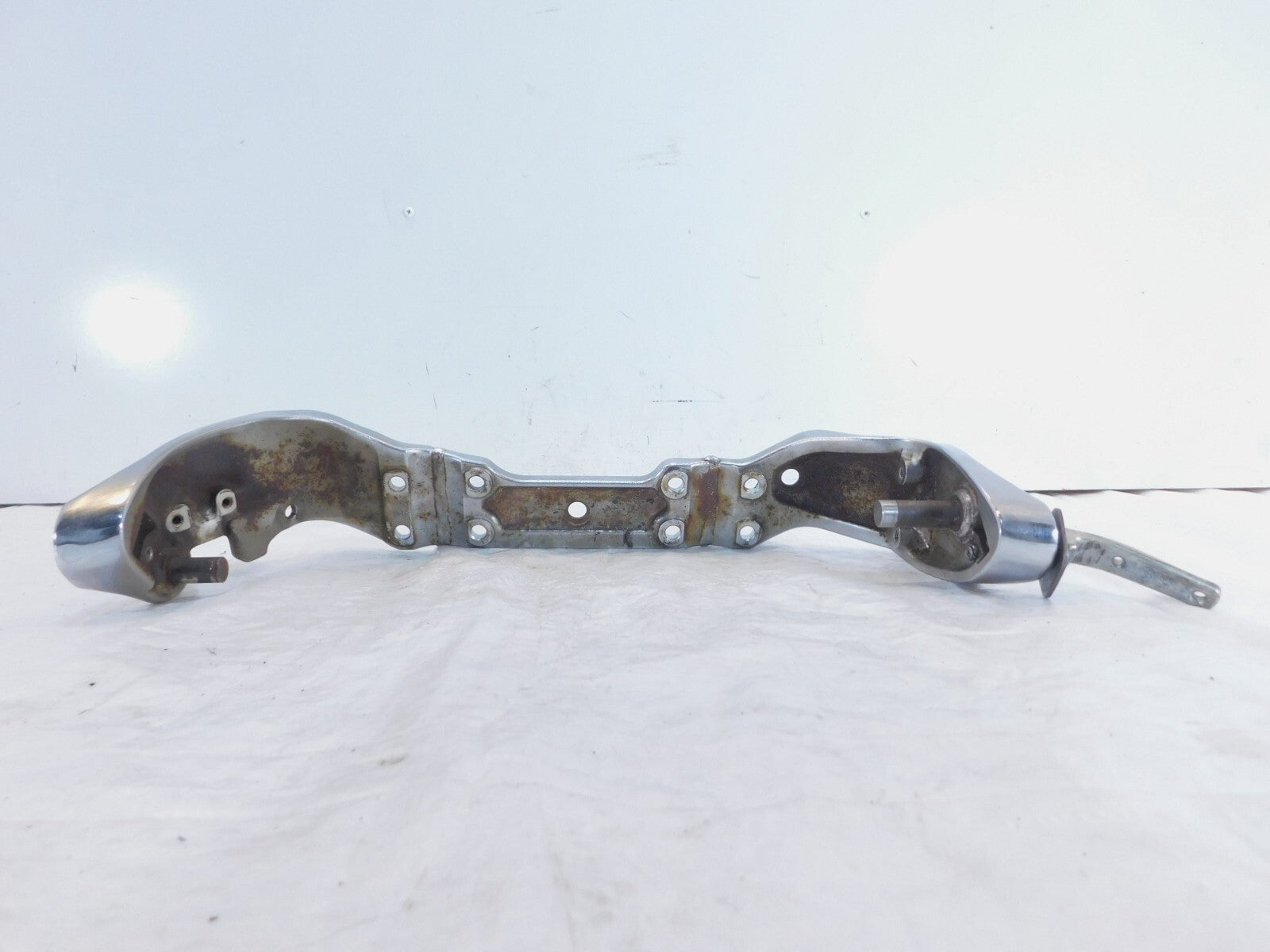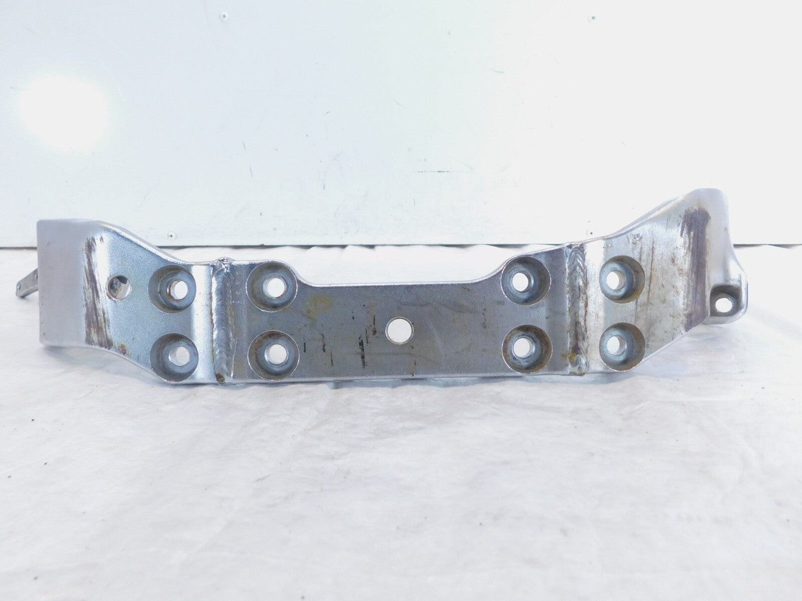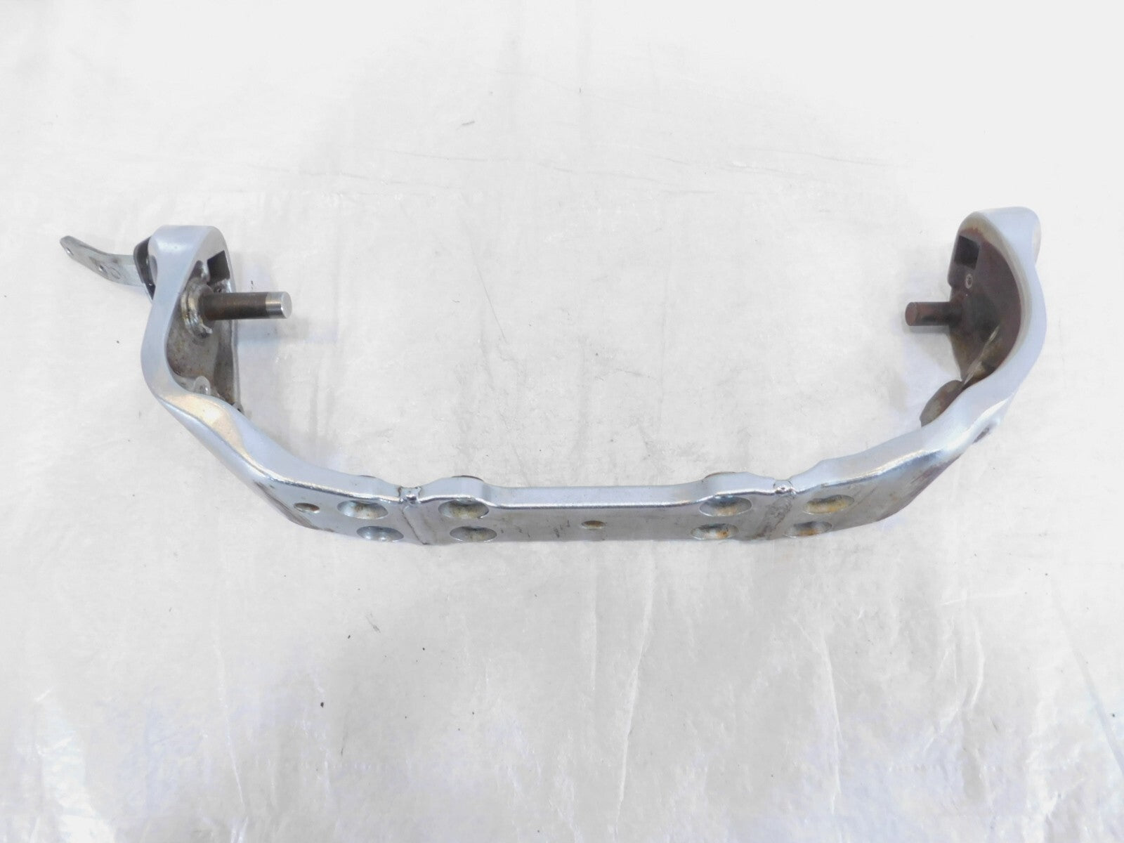 This is a used front footpeg bracket. It is a little dirty from previous use and storage and there are some spots of surface rust and rash (as pictured).