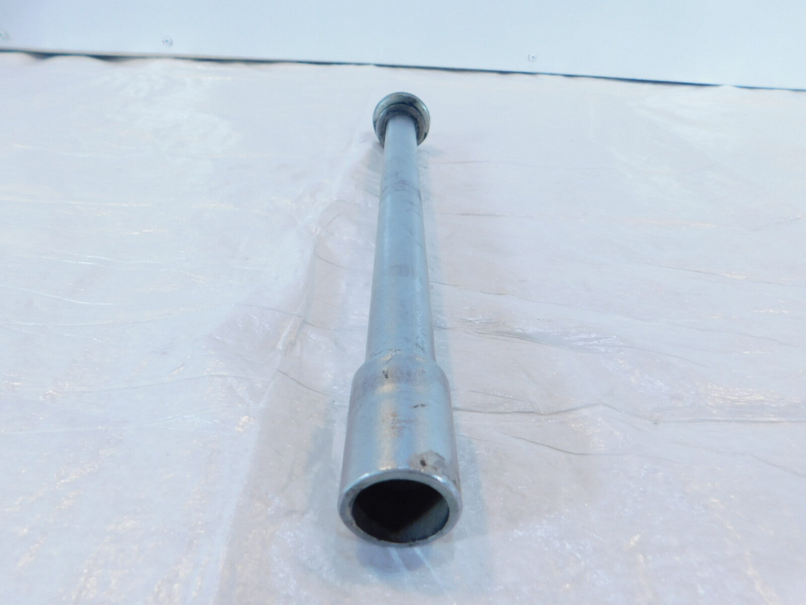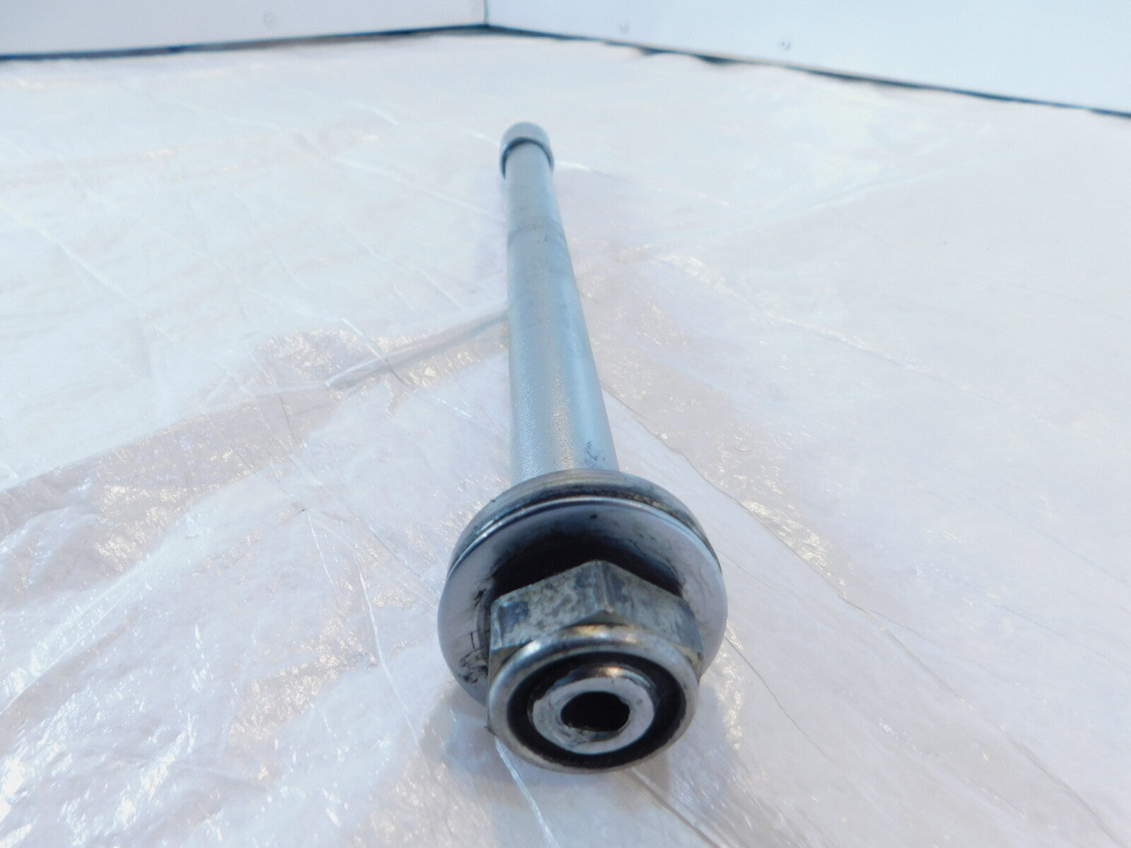 This is a used rear wheel axle in good condition. It is a little dirty and has some marks from previous use and storage but it looks good.