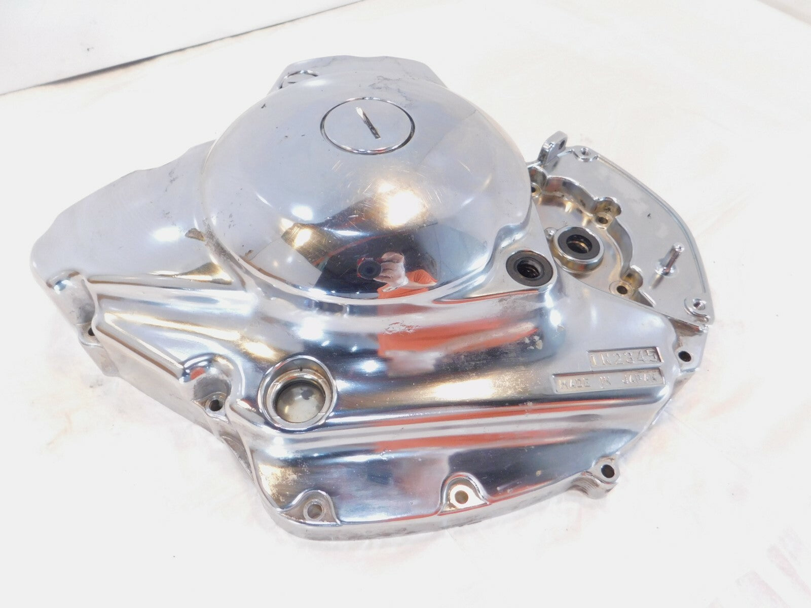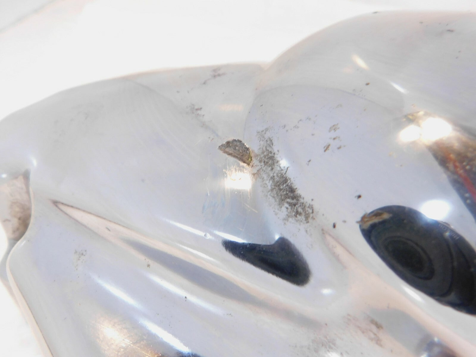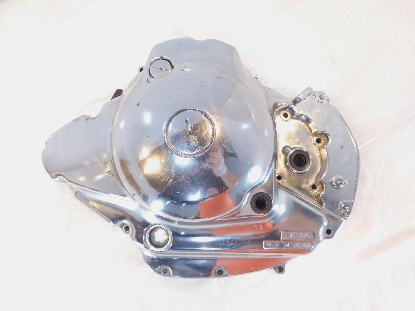 This is a used stator cover in good condition. It is a little dirty and has some marks from previous use and storage and has a small rash spot and some bubbling in the chrome (as pictured).